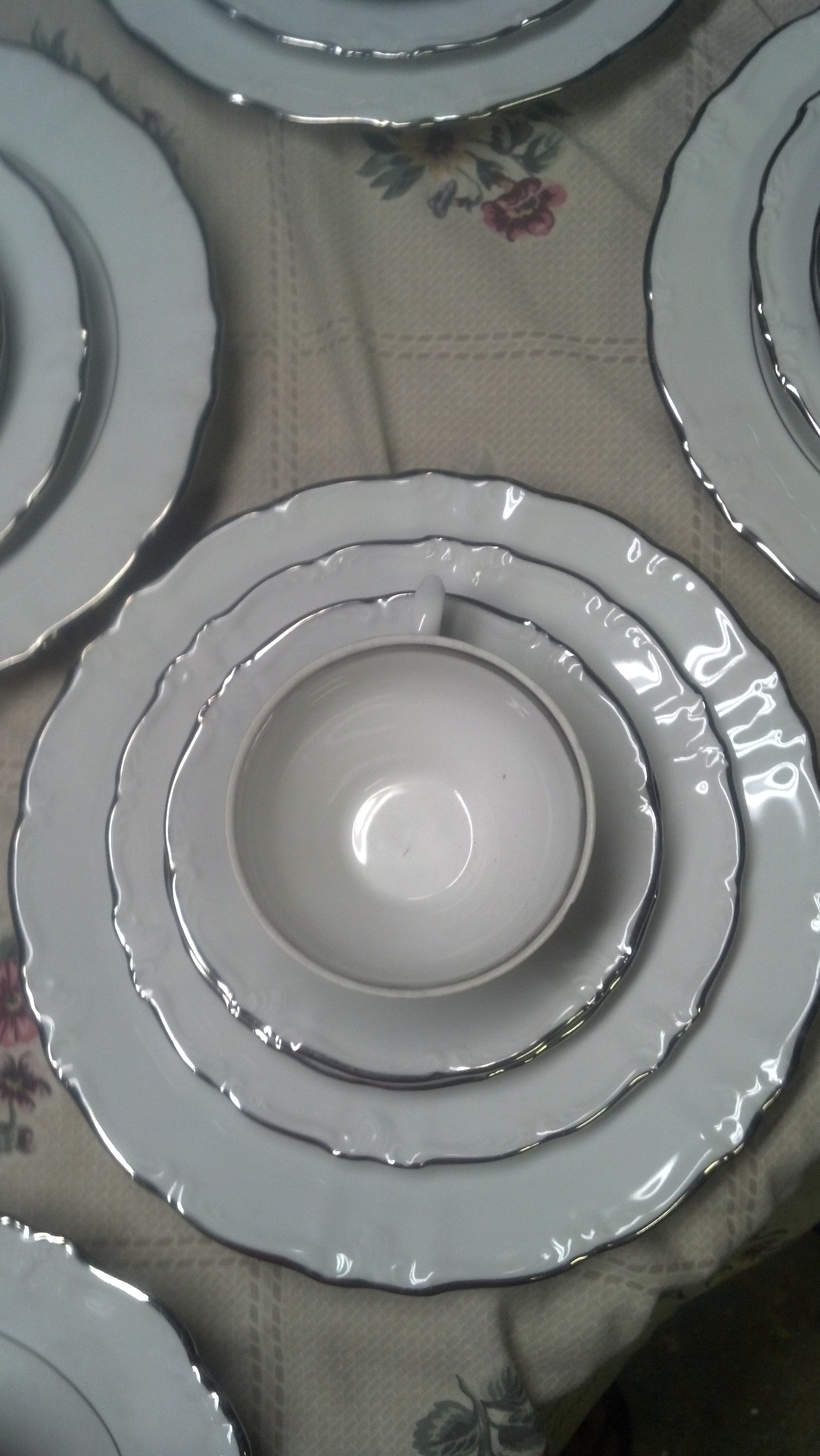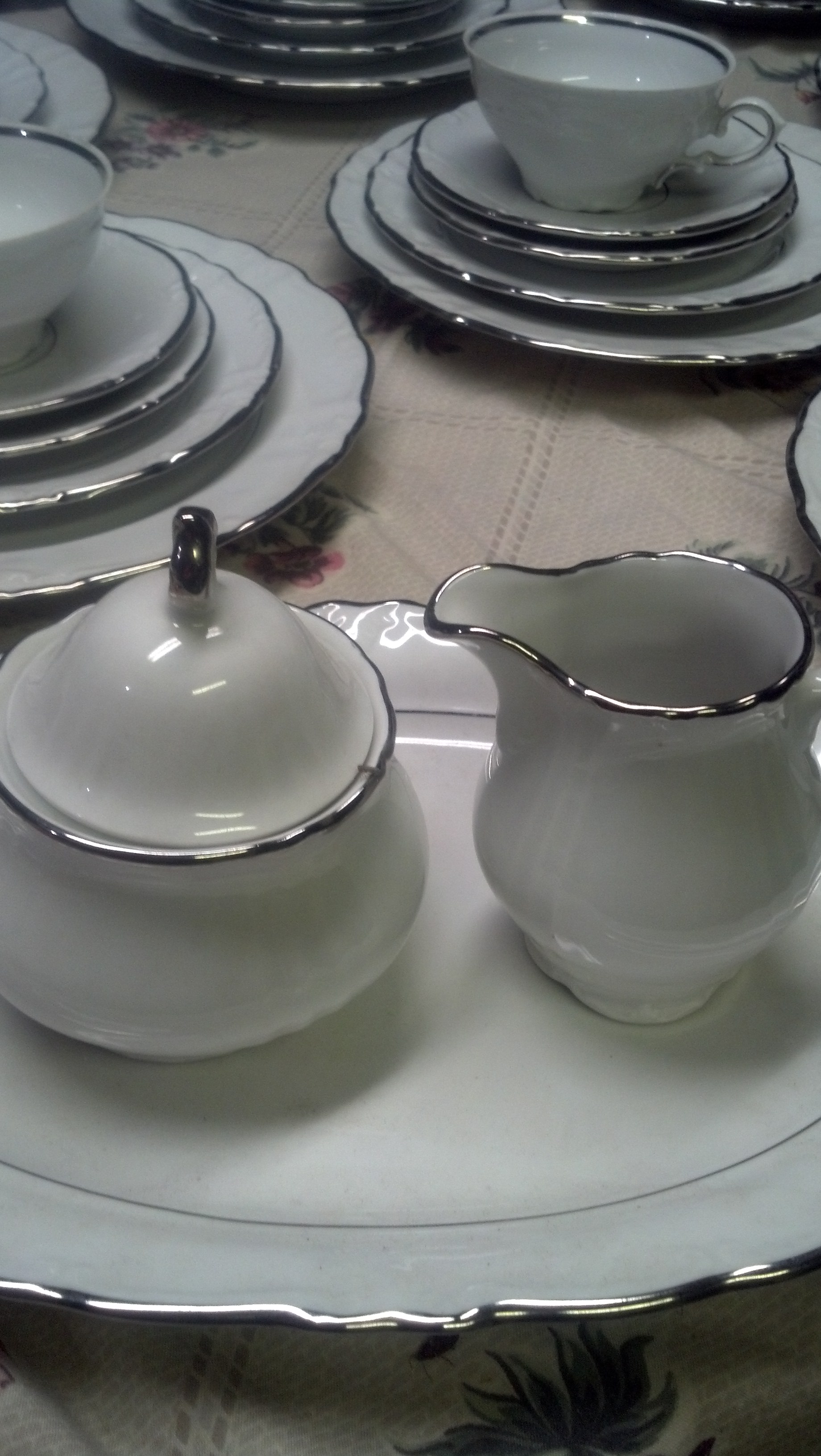 Set of 44 pieces I believe from the 70s. White with silver trim. Never used all great condition