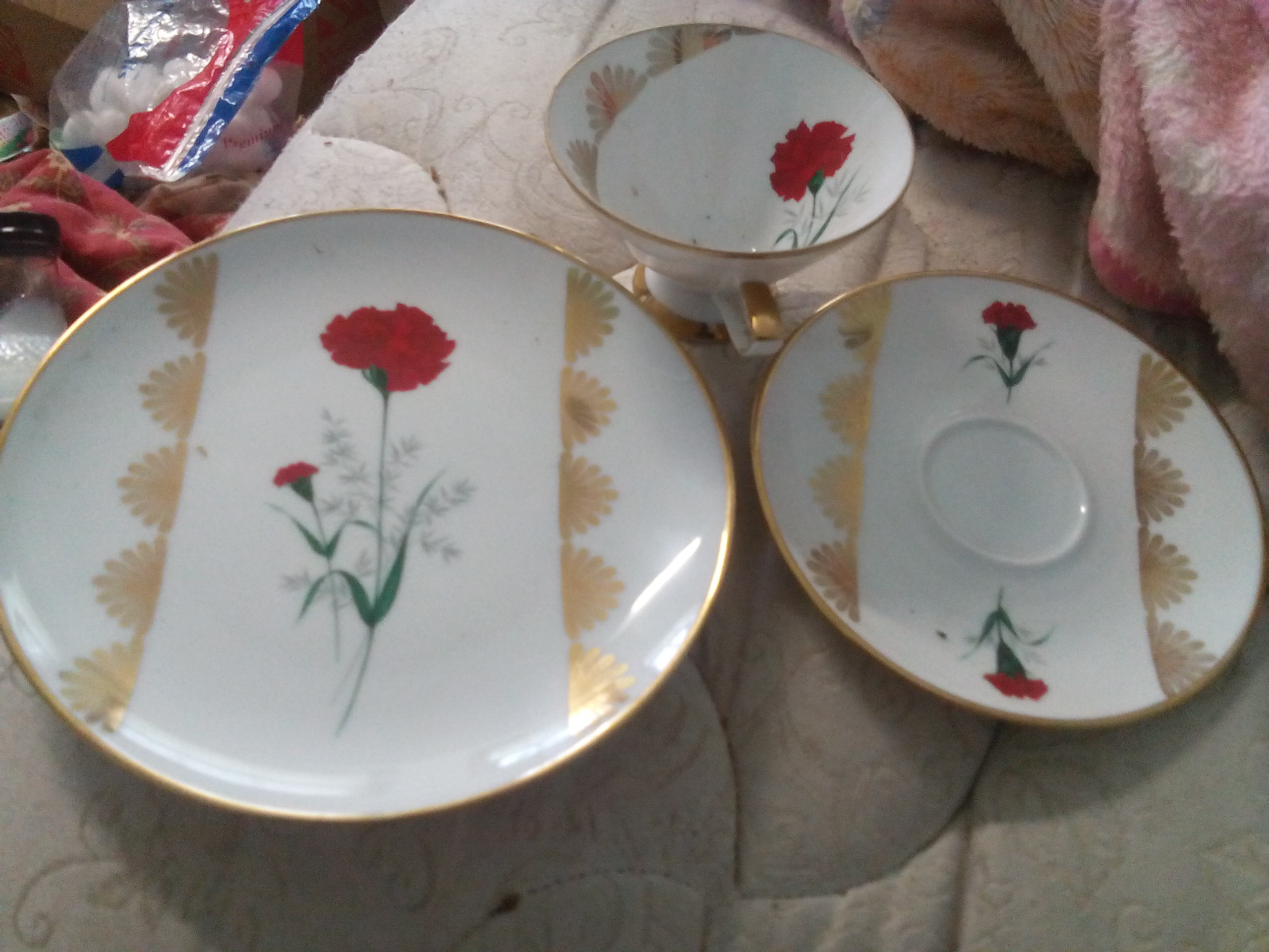 Description One plate, one saucer, and one cup. The stamp says Winterling Rösigm Bayaria. All I know about it is they were used in the 1950's