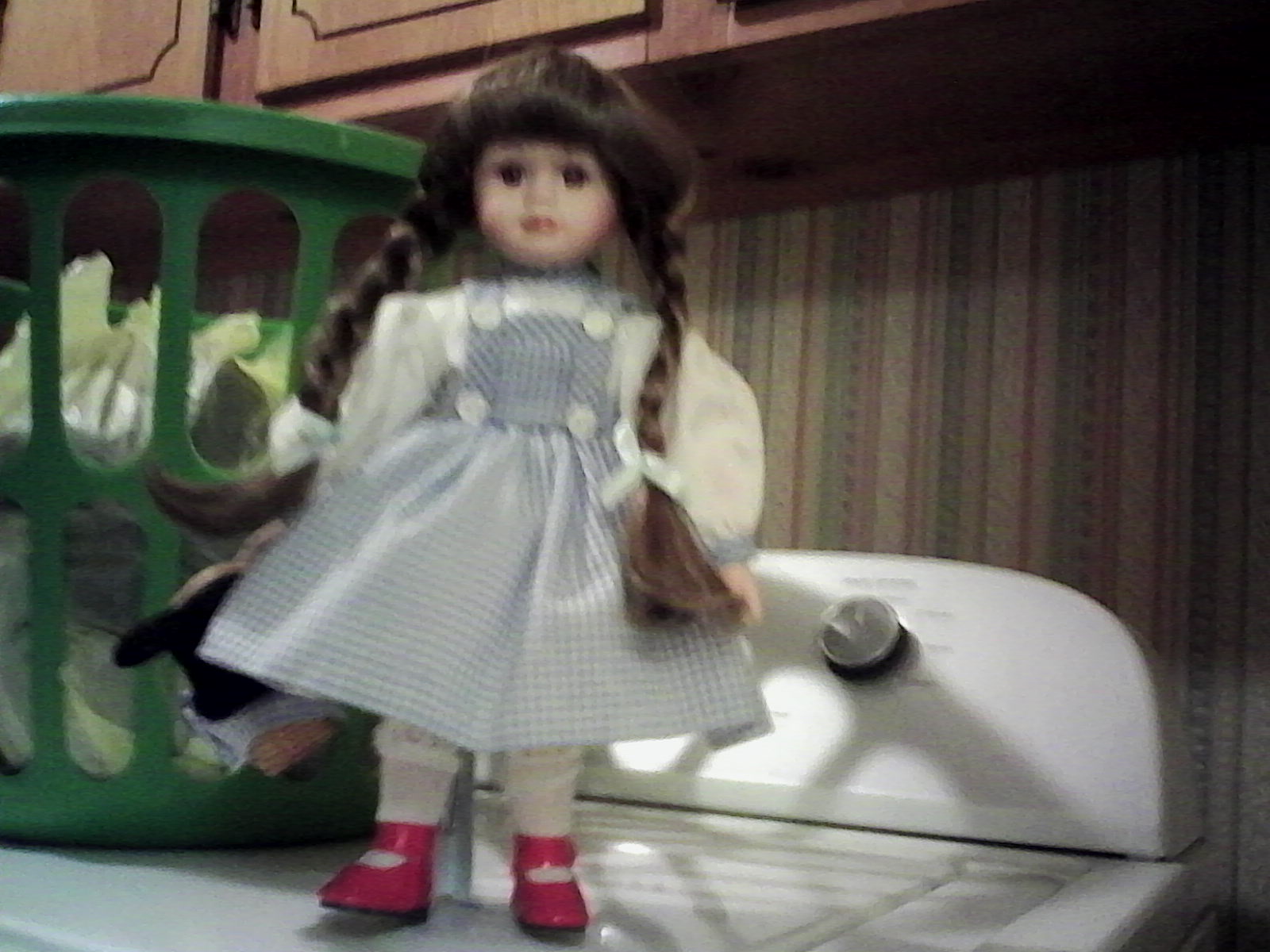 11" tall with stand.long pigtails braided, blue & white checkered dress with white long sleeve blouse, red shoes, basket in rt hand with Toto inside. Head,hands & legs are ceramic.