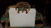 The handbag is made of purple sequins and it has an illustration of the red shiny shoes that Dorthy wore in the movies. The color in the red shoes had gold sequins in the inside and the buckle in the front respresents a bow.A gold chain strap that holds the bag if you want to wear it, and it also has a clamp to open and close the bag. The tags on the purse has a picture of Dorthy from the Wizard of the Oz and the description of it.