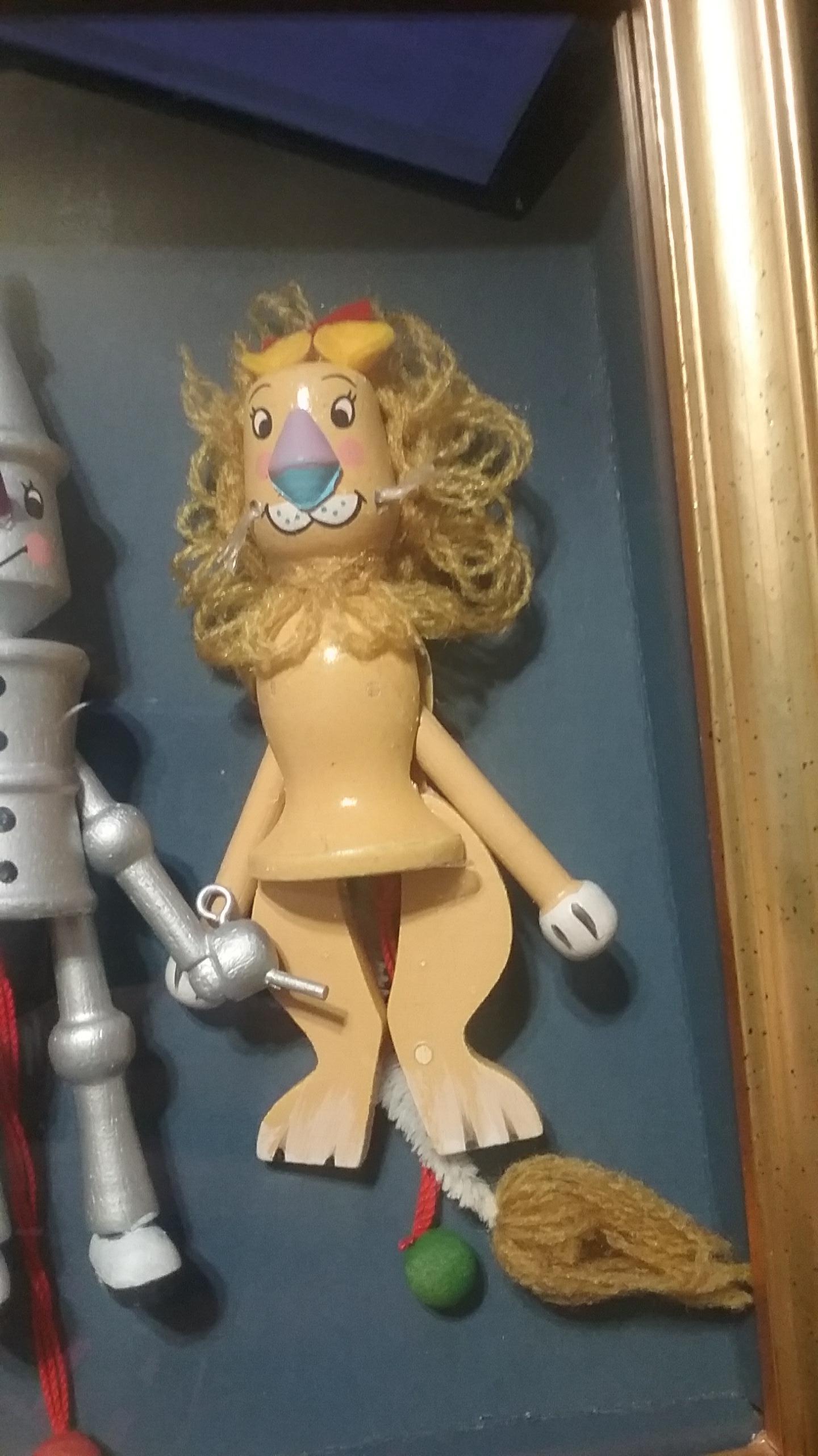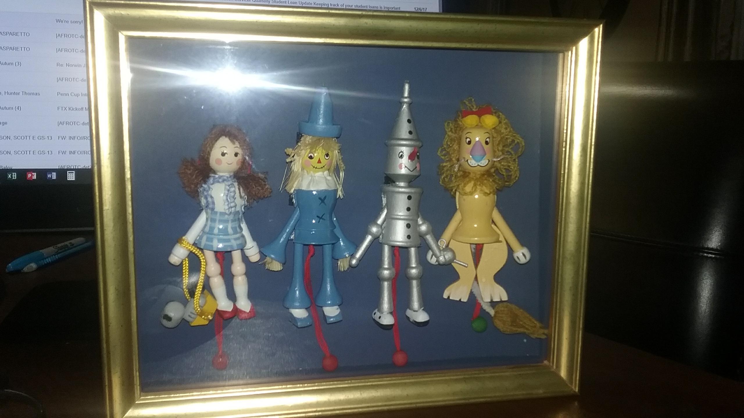Wizard of Oz Small Wooden Puppets with Dorothy, Scarecrow, Tin Man, and Lion in Wooden Frame and Glass Case