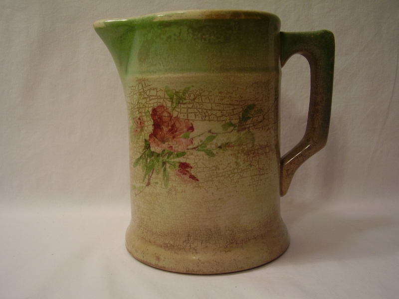 7 1/8" tall and 4 3/4" across at top, not including the spout. A few minor chips at top edgeand much crazing. Not sure of age, but would guess it to be rather old. No other damage, such as other chips, cracks, etc. Rose design is on both sides.