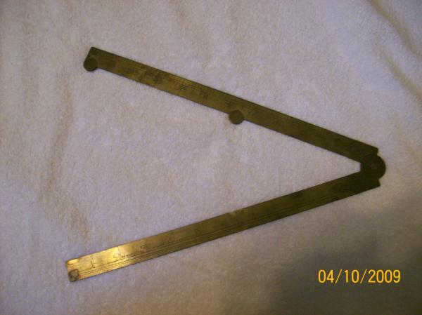 This a solid brass foldling rule with ornate design of leaves and acorns on the hinge. The holders are in tack that holds the sides together. If cleaned up would be near excellent condition. All numbers are very legible to the naked eye.