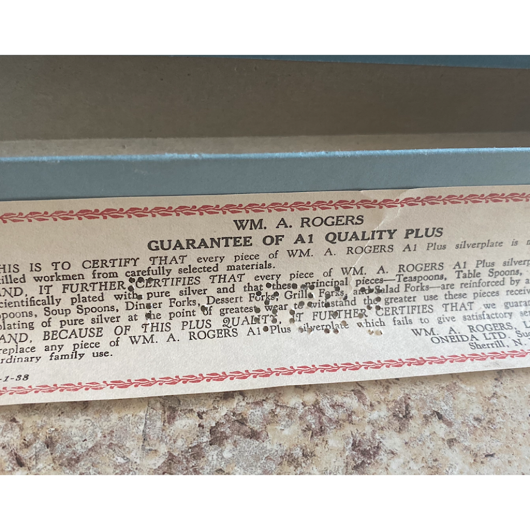 WM A Roger’s A1 Plus Teaett spoon in perfect condition. Needs some polishing but otherwise impeccable. Never used. Original box and certificate of authentication. Box dated 1-22-38. Certificate dated 2-1-38.