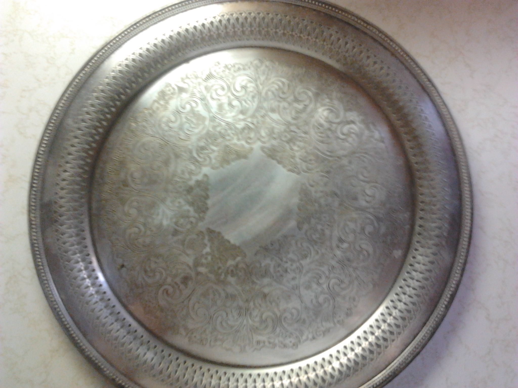 A rather ornate silver or.plated tray. Bottom has an adhesive sticker which is difficult to read, but can make out WM A ROGERS SILVERSMITH.