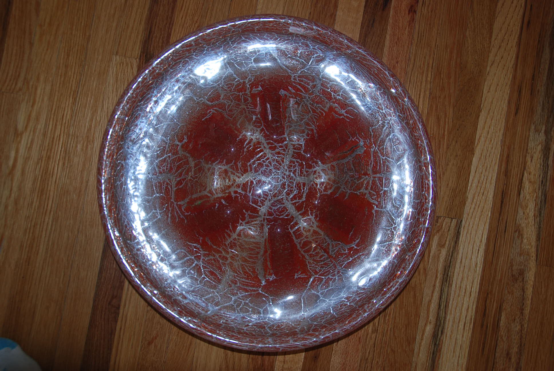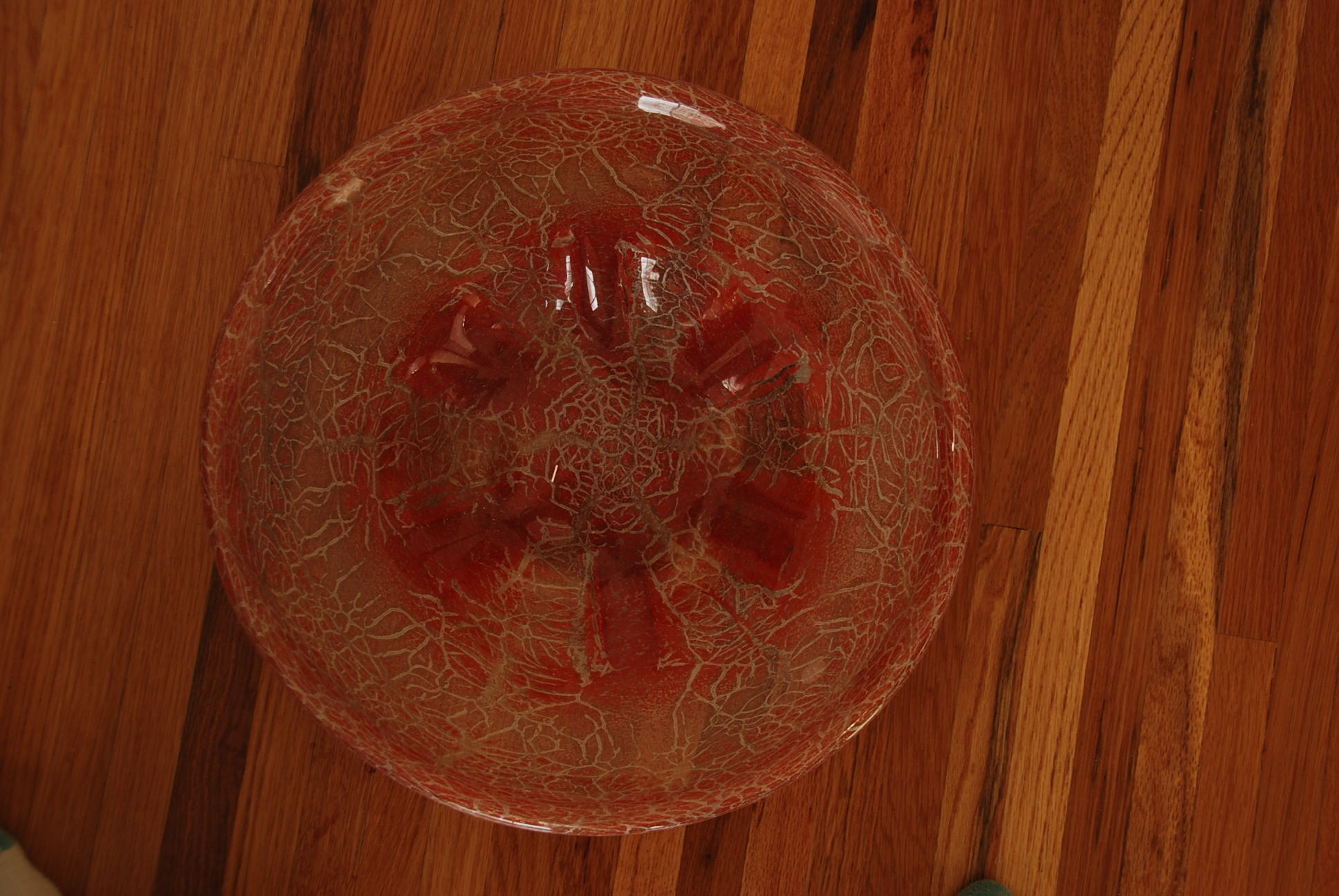 this is a WMF crystal/glass bowl that is 171/4" in diameter the edge is rounded with a little drop to the "shelf part of the bowl which is about 4" wide then drops into the bowl it is about 2 3/4" tall it is orange in color with clear & white marbling. I have looked to find a value but all the bowls I found where much smaller. The story behind it is that every year employees where allowed to make one piece for themselves & this is one of those pieces. Yet I can not find a value on it anywhere. It has a beautiful sound when tapped like a piece of crystal glasswear