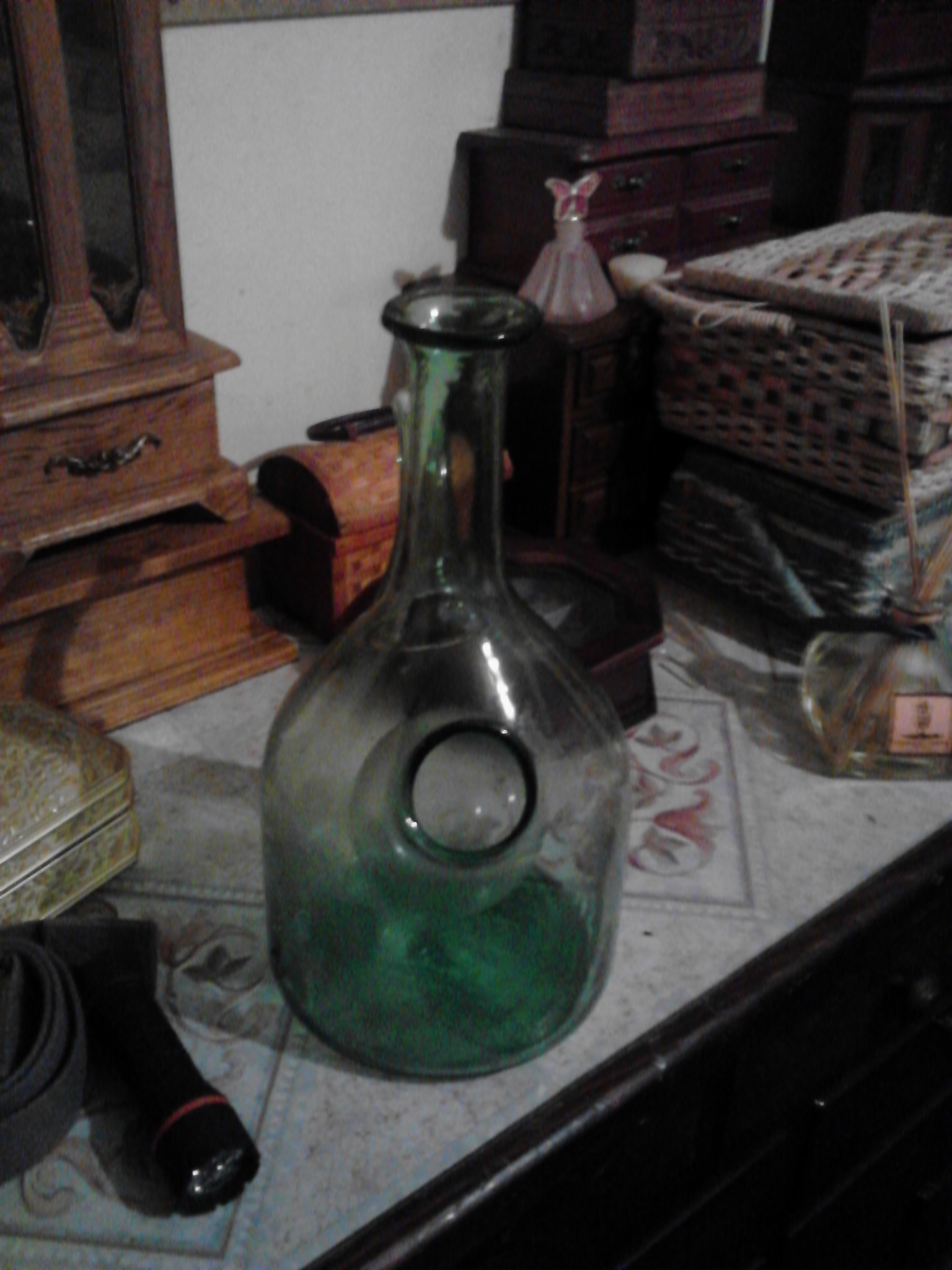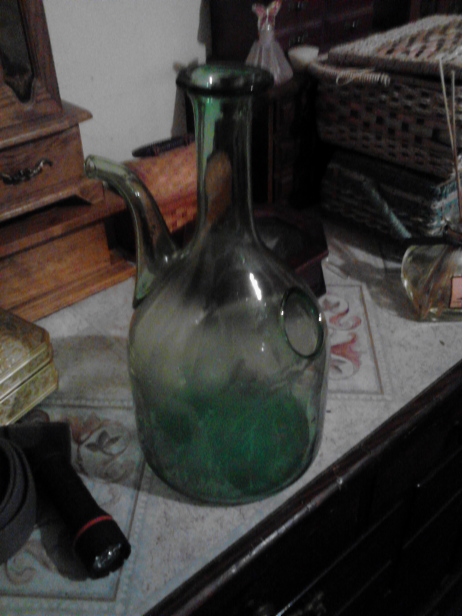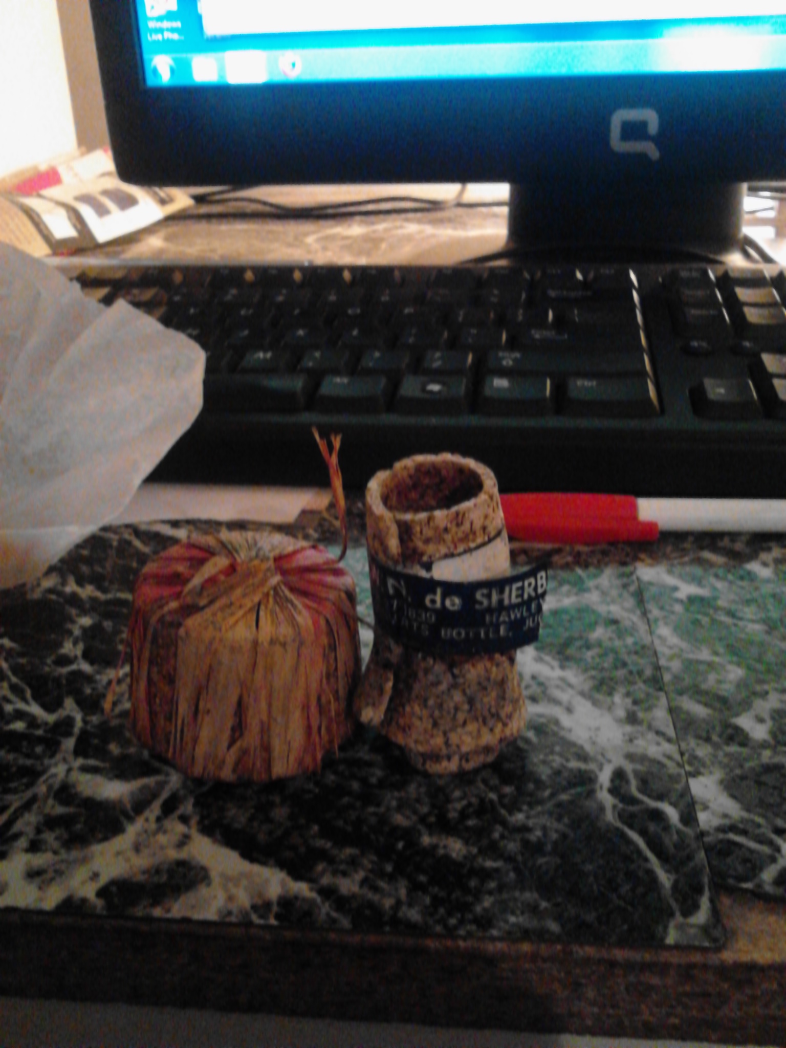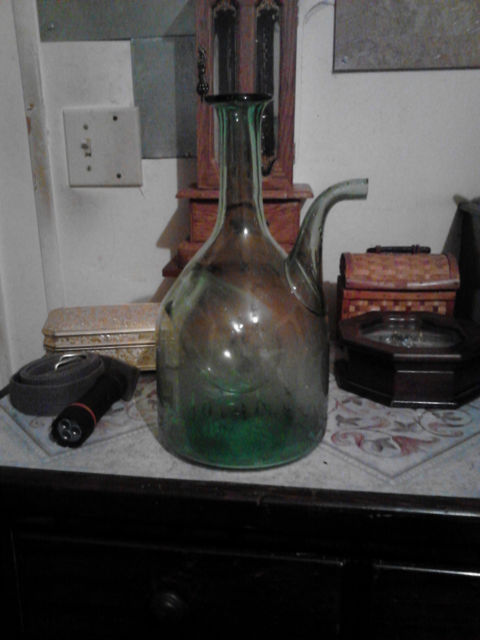 I found this item in the woods, as luck would have it no damage was done. I have both corks for the top and for the indention. The top cork is hand rolled with the lable around it. The other cork in the Indention is a large cork with what looks like a corn husk covering. My mom has one exactly like it in mint condition. hers has a chain that conects to the top cork to the a cap on the spout. It was a gift to her years ago so she has no idea what it was/is used for. Both my mom and I are curious to know what the value is. It is a cool piece and would not want to sell it.