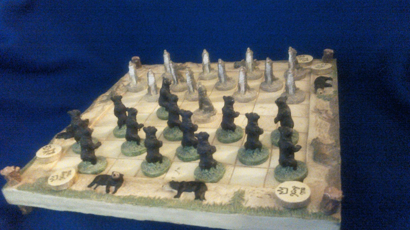 The Wolf and the Bear checker board measures 10"x10" and is very detailed in a woodland scene. On the reverse side is a Tic Tac Toe board. The player pieces are of a sitting howling gray wolf 1.5 inches tall anmd the other is of a standing black bear 1.5 inches tall. There are "King Me Disc" included and the set is complete.