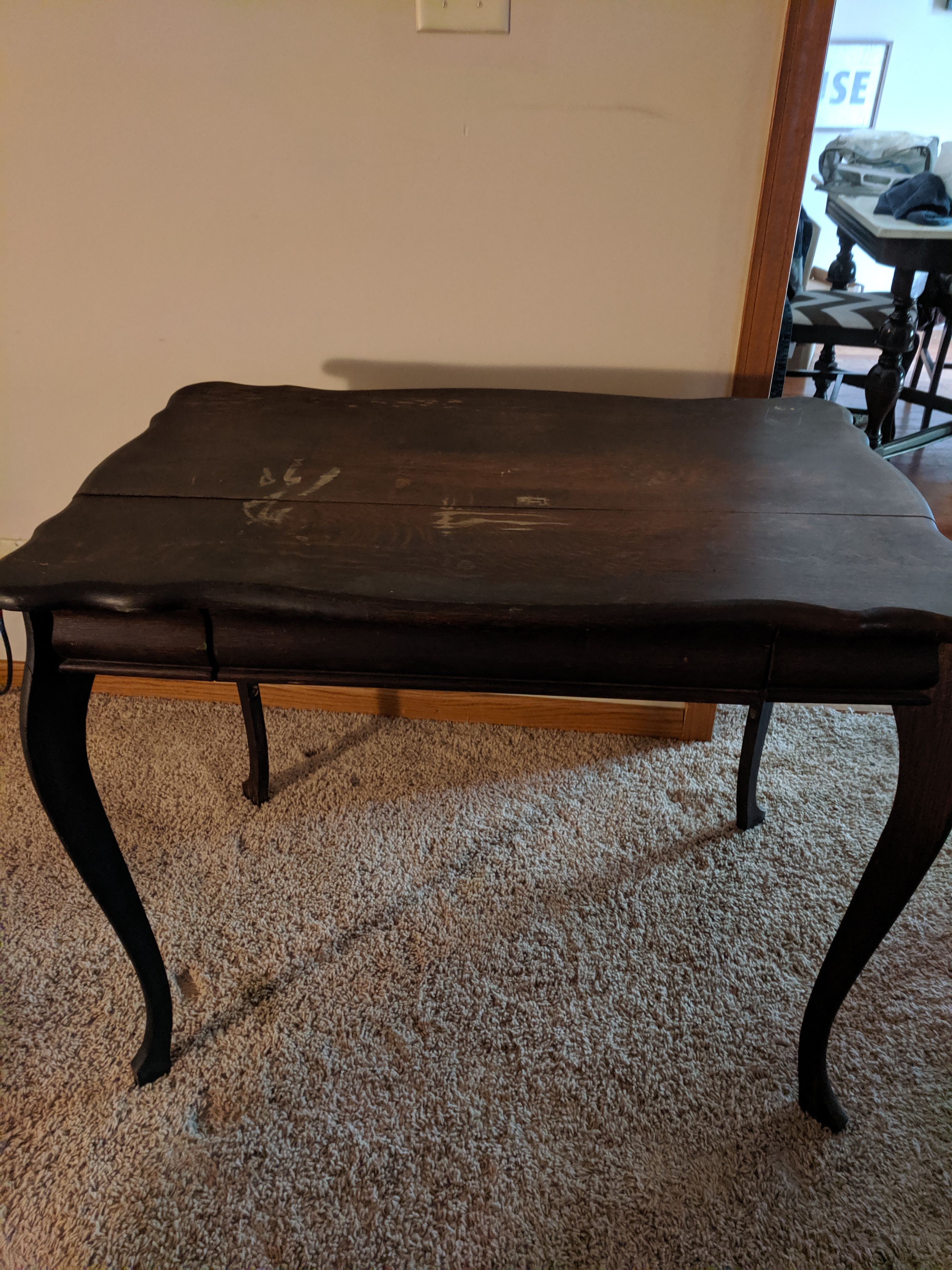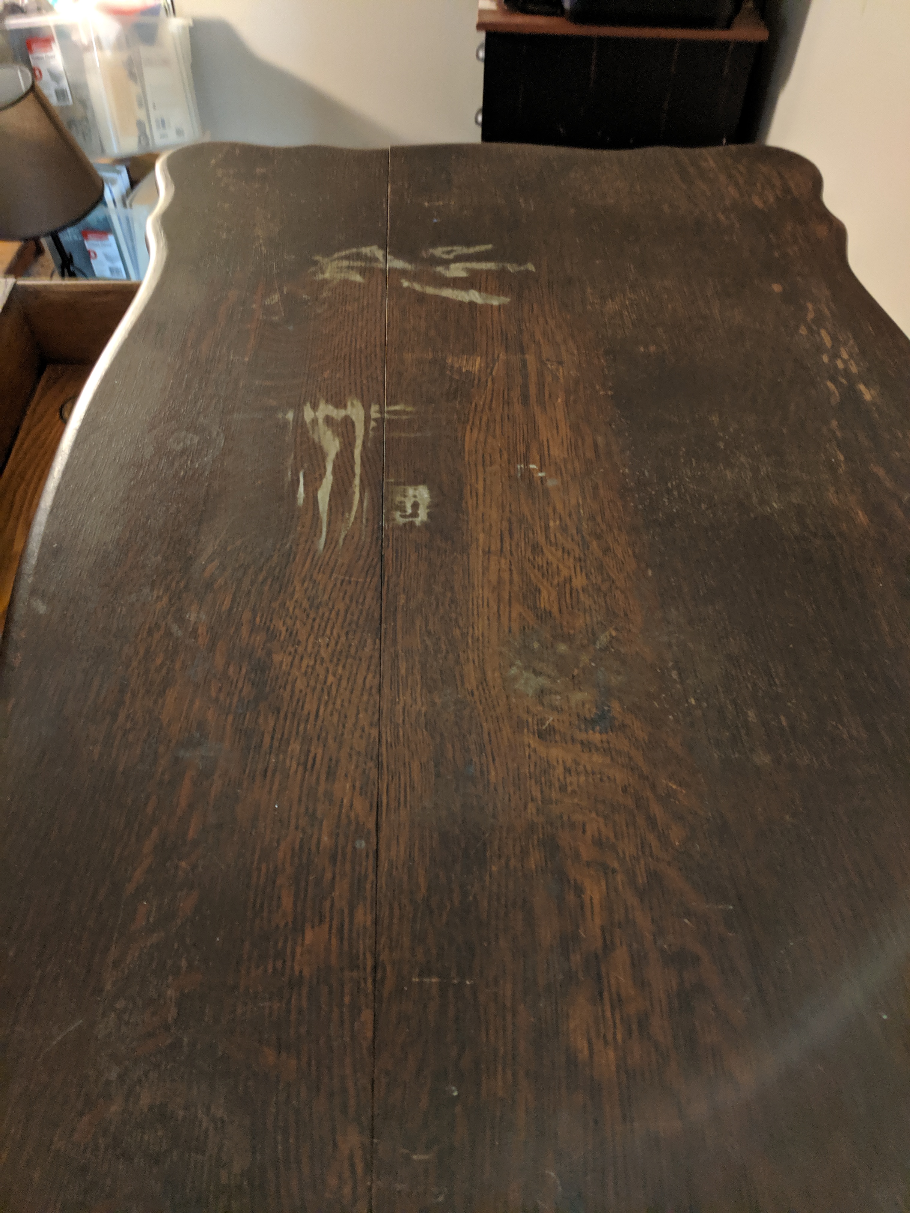 The table is in fair/poor condition. The top has a crack all the way across and has stains. The Wolverine logo is intact inside the drawer.