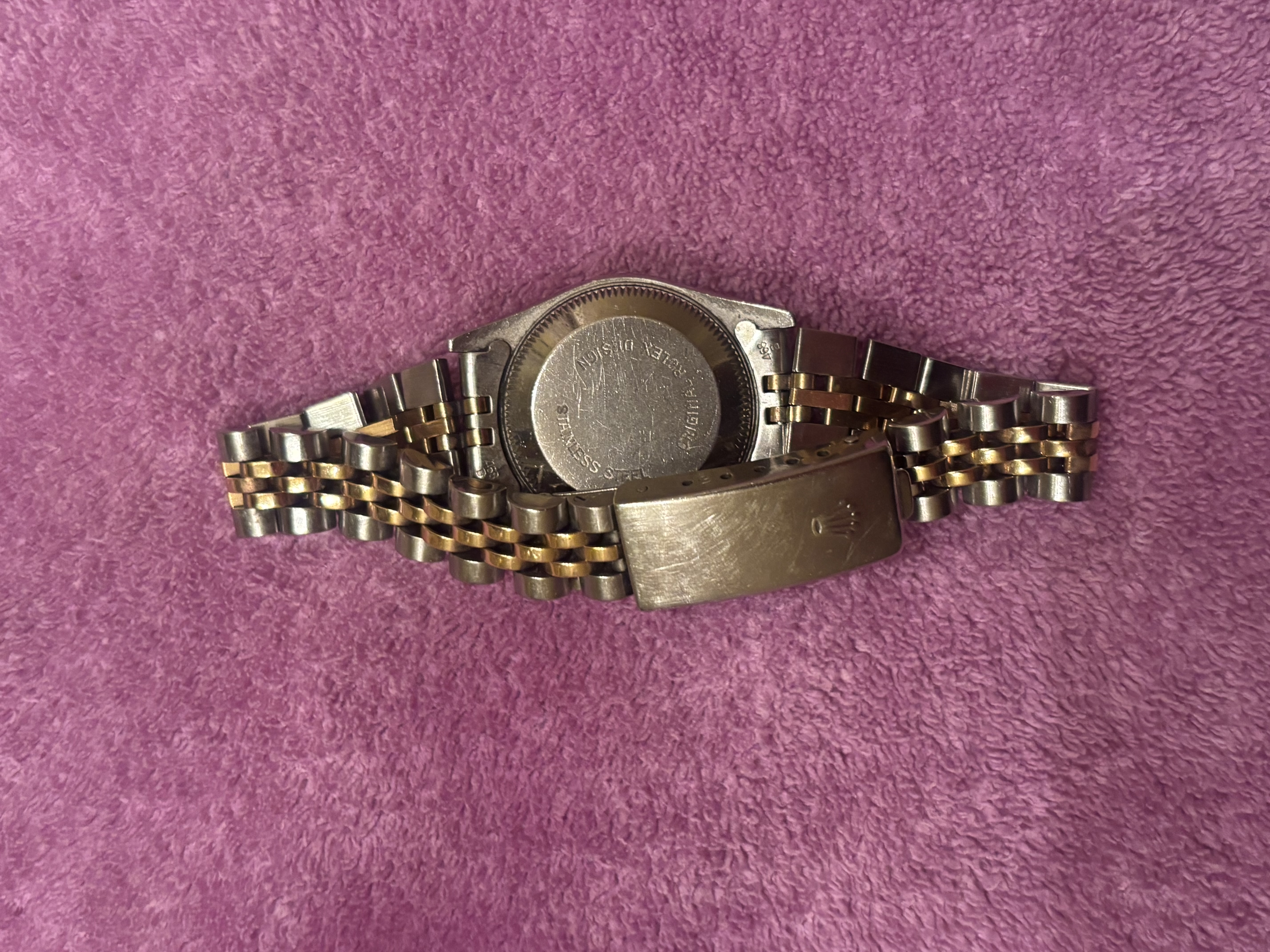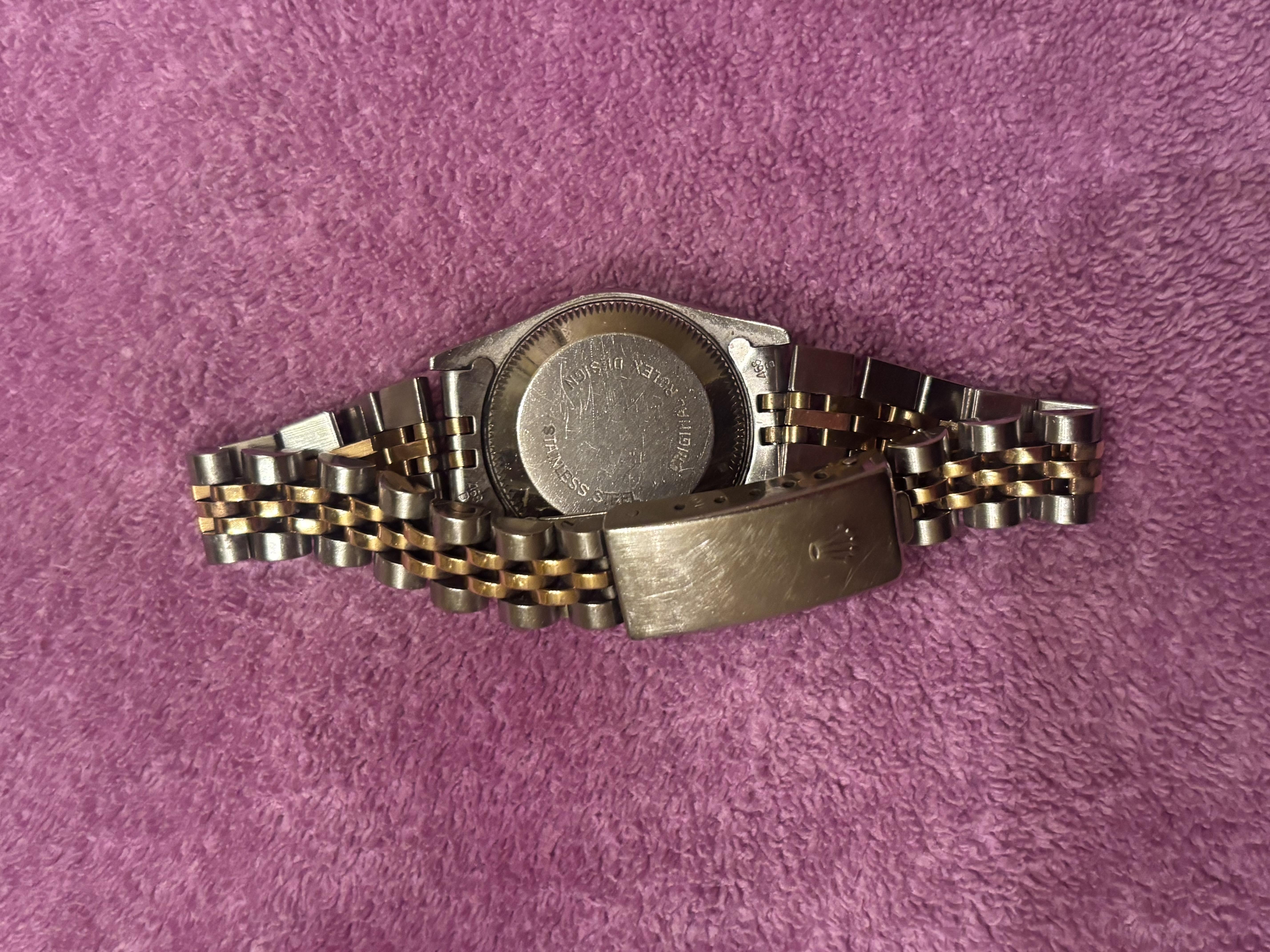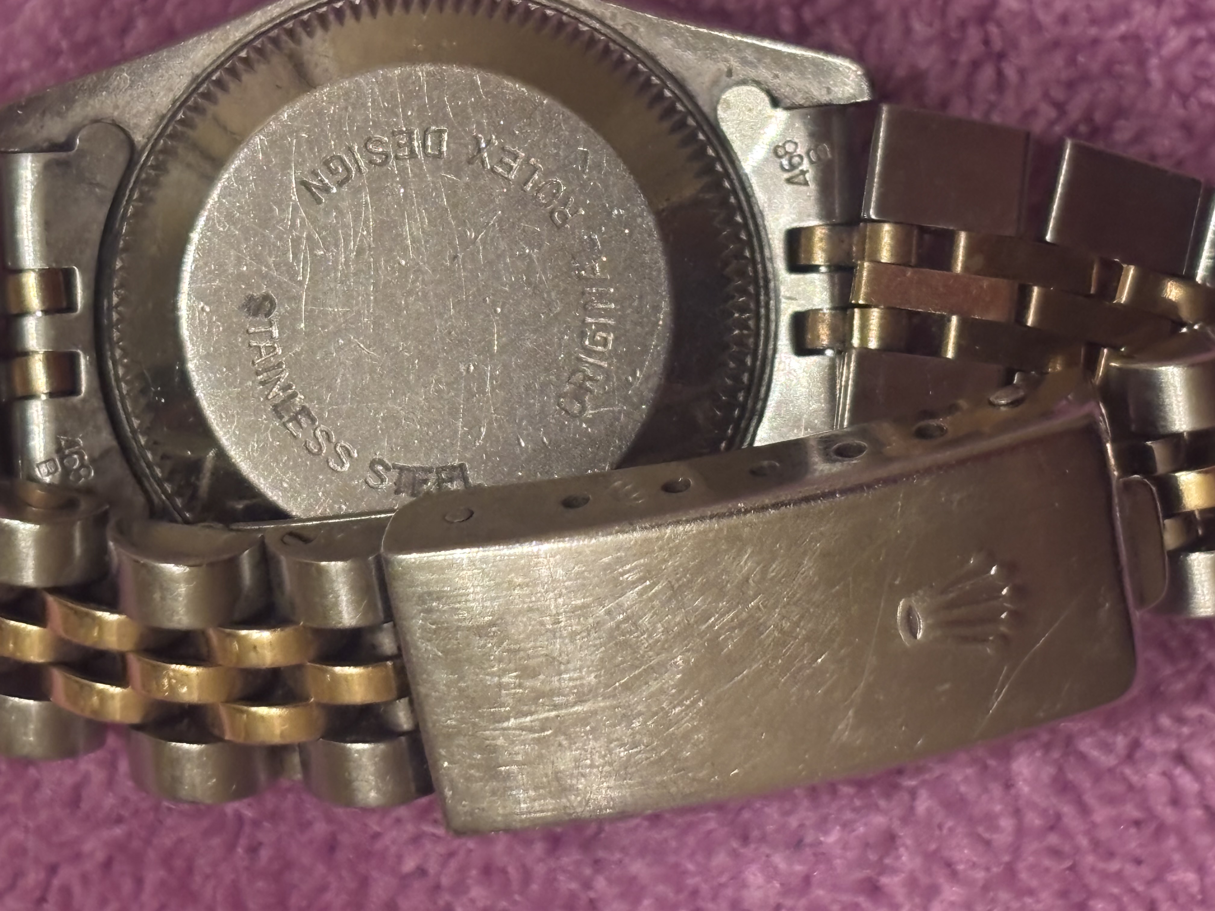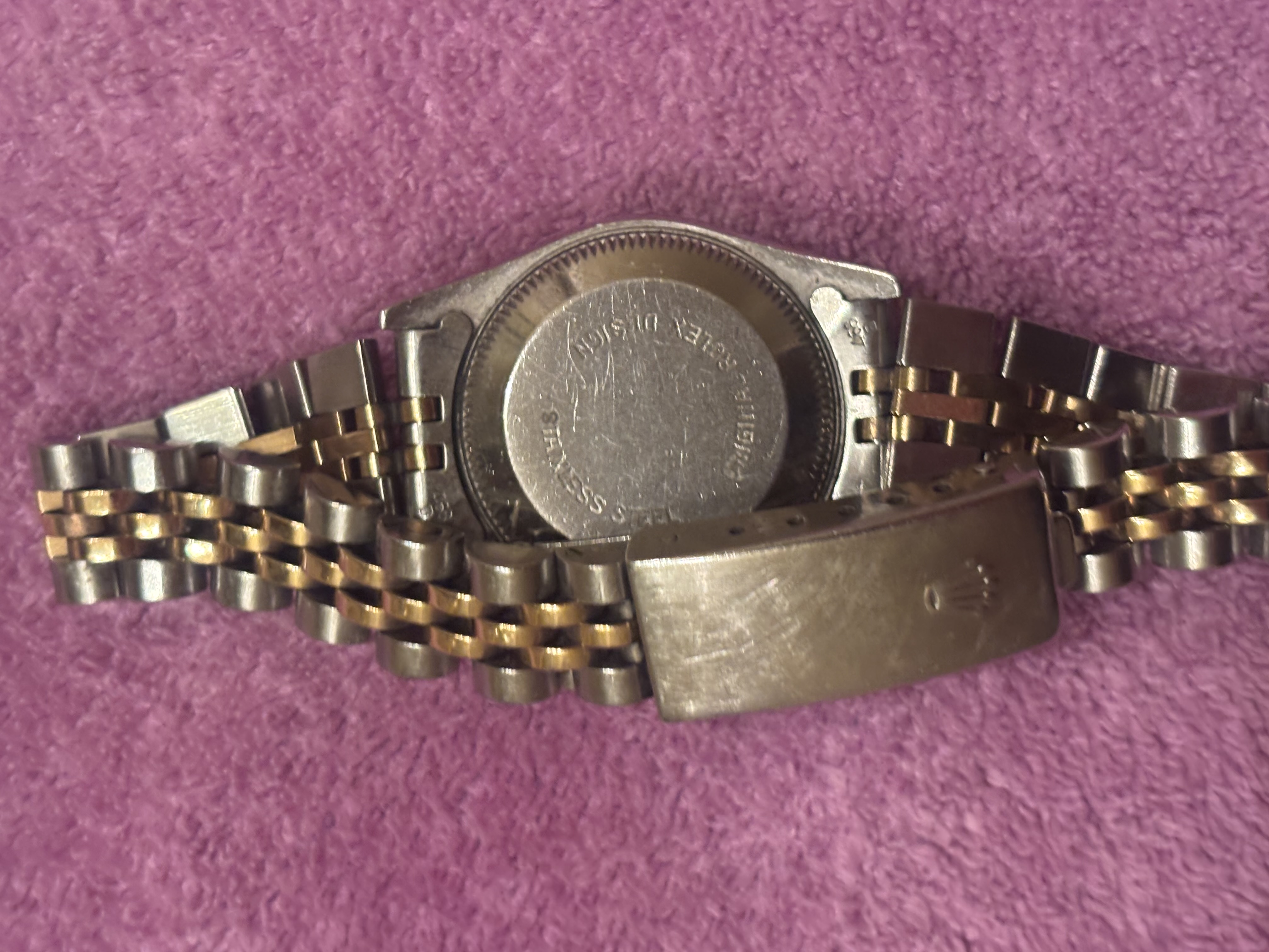 Brand is clearly visible on the watch face and clasp. However, authenticity cannot be verified from photos alone due to the high counterfeit risk associated with Rolex watches.