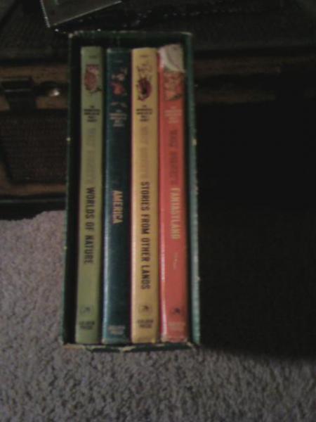 Walt Disney Boxed book set, Golden Press Walt Disney's "World of Nature #15591, Walt Disney's "America" #15592, Walt Disney's "Stories from Other Lands" #15593, Walt Disney's "FantasyLand" #15594 (slight tear in top of book binding. Includes the box in excellent condition. This set includes most of the Disney Favorites