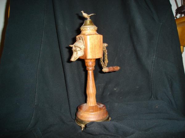 Not sure what it is. 9" tall, I believe the wood is cherry or walnut. There is a brass boar's head on the front, a brass pheasant topper and brass turn handle on back. There is a music box on the bottom, unfortunately it does not play music.