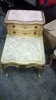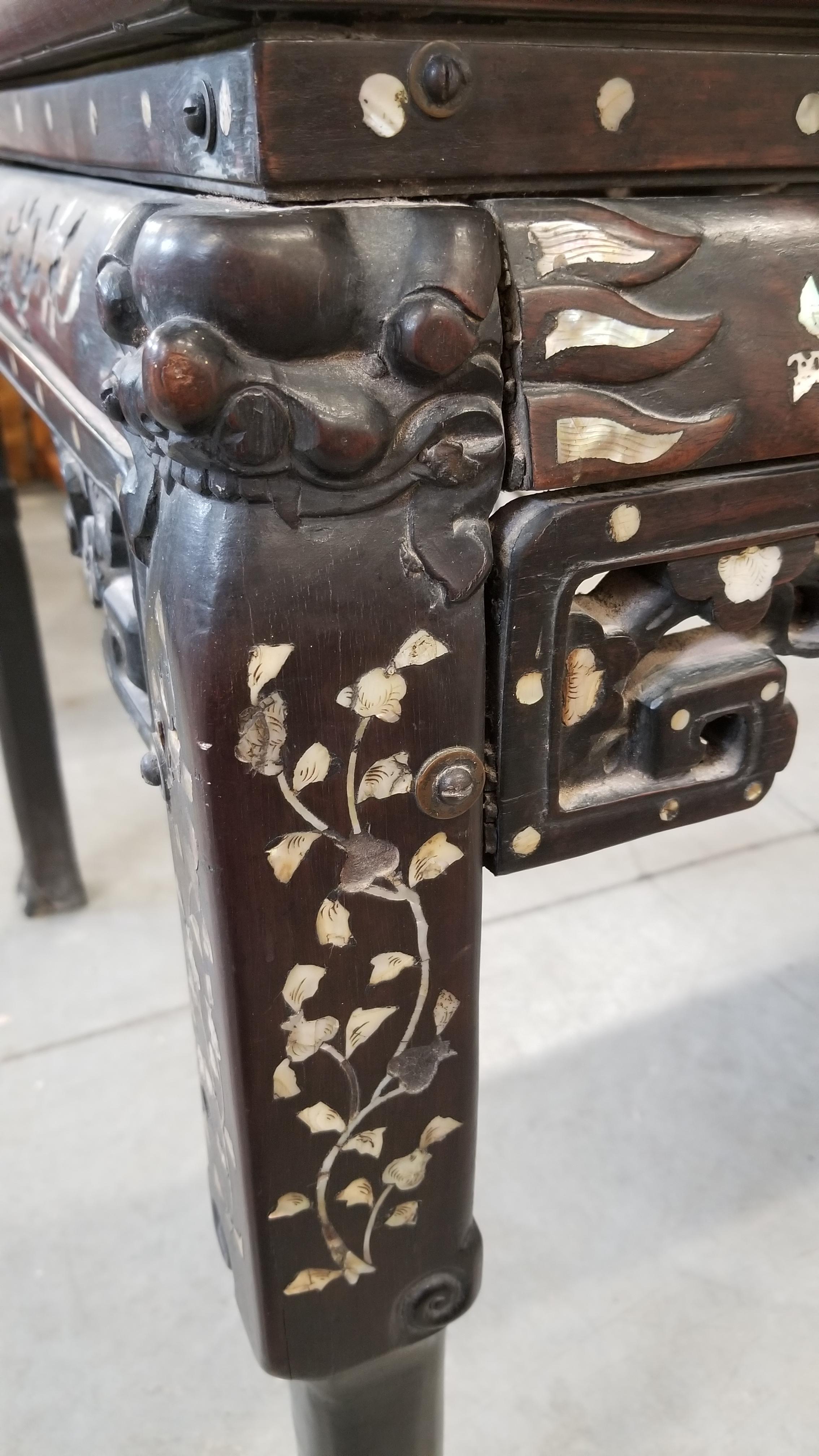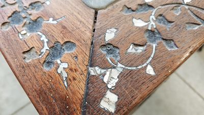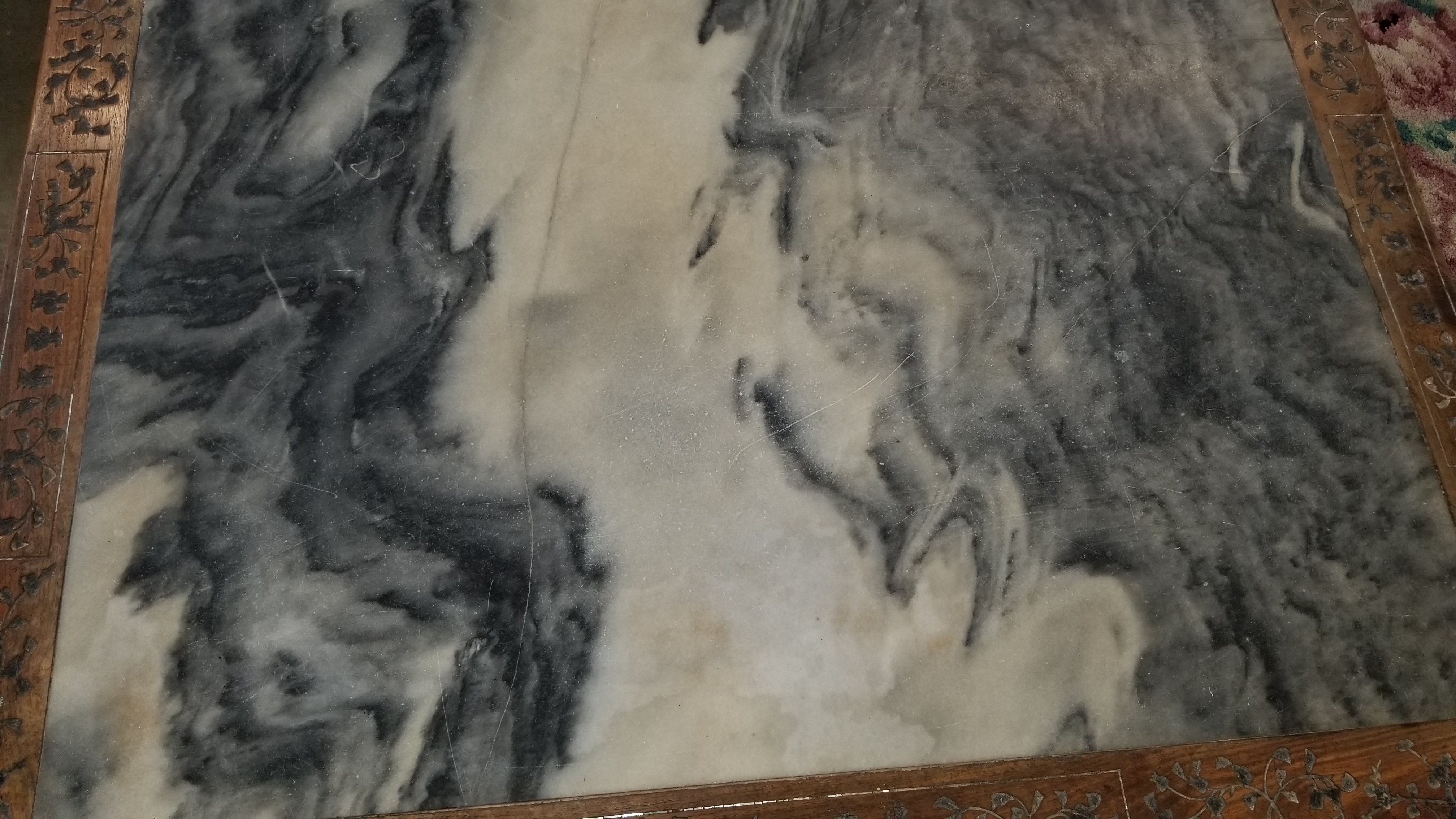 This table measures 30.5" tall, 48" long, and 35.5" wide. It is made of wood and has a type of stone on the top that looks like a type of marble with one long crack and one medium length crack. The cracks are quite smooth and have obviously been there quite some time when you run your fingers along them. The engraved leaf decoration along the sides and part way down the legs have what appears to be some sort of pearl looking stone (or similar). However, most of the pearl-like stuff has fallen out. The screws that are used are an older style flathead.