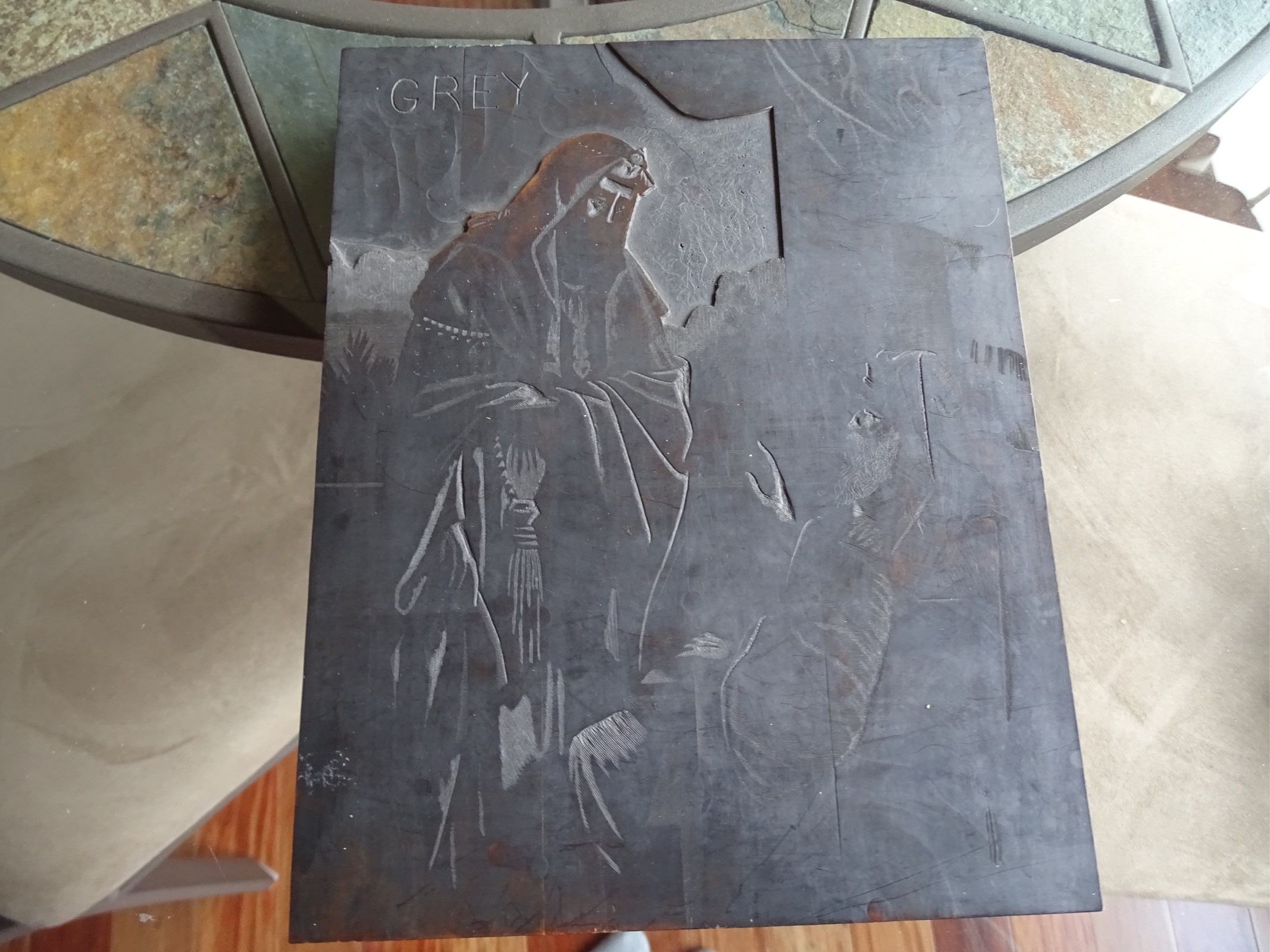 An engraving on a block of wood of a man with a beard with a long robe and hat who is speaking to another man who is seated in a chair. The engraving plate if that is what it is appears to have old ink on it. The word GREY is carved into the top left side of the plate.