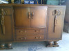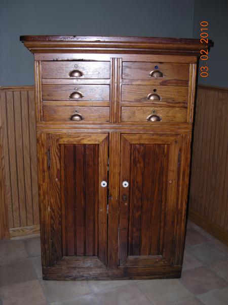 The cabinet has 6 small pull out drawers and 2 door that open on the bottom with shelves on the inside. It had been refinished before I purchased it. The drawer and door handles don't seem to be original.