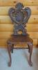This chair appears to have some sort of god figure carved into the back. It has old tapestry for the back and seat. the wood is carved around the seat and on the feet as well.