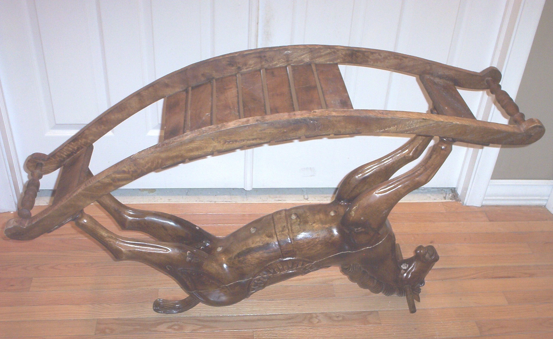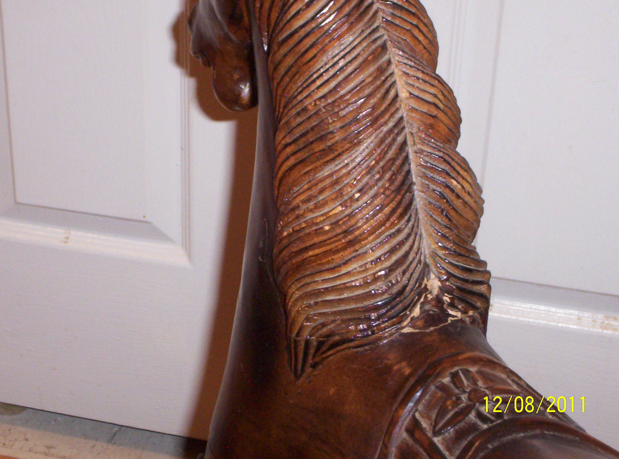 I believe this is a hand carved, wood rocking horse that stands 31" high & is 4 ' long. There are 4 holes in the underbelly that are 1" wide & 3" deep - may have contained some type of weights as horse is tipped somewhat forward. There is a chip off one ear and a long horizonal crack on the right side.