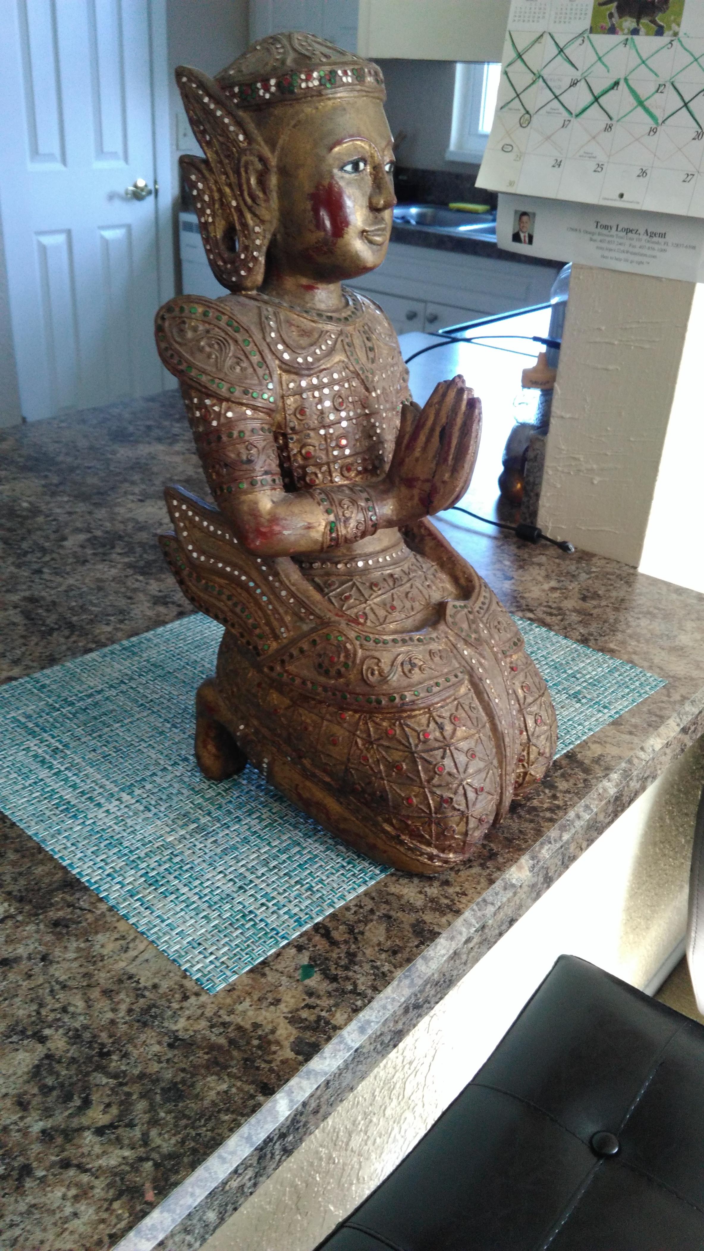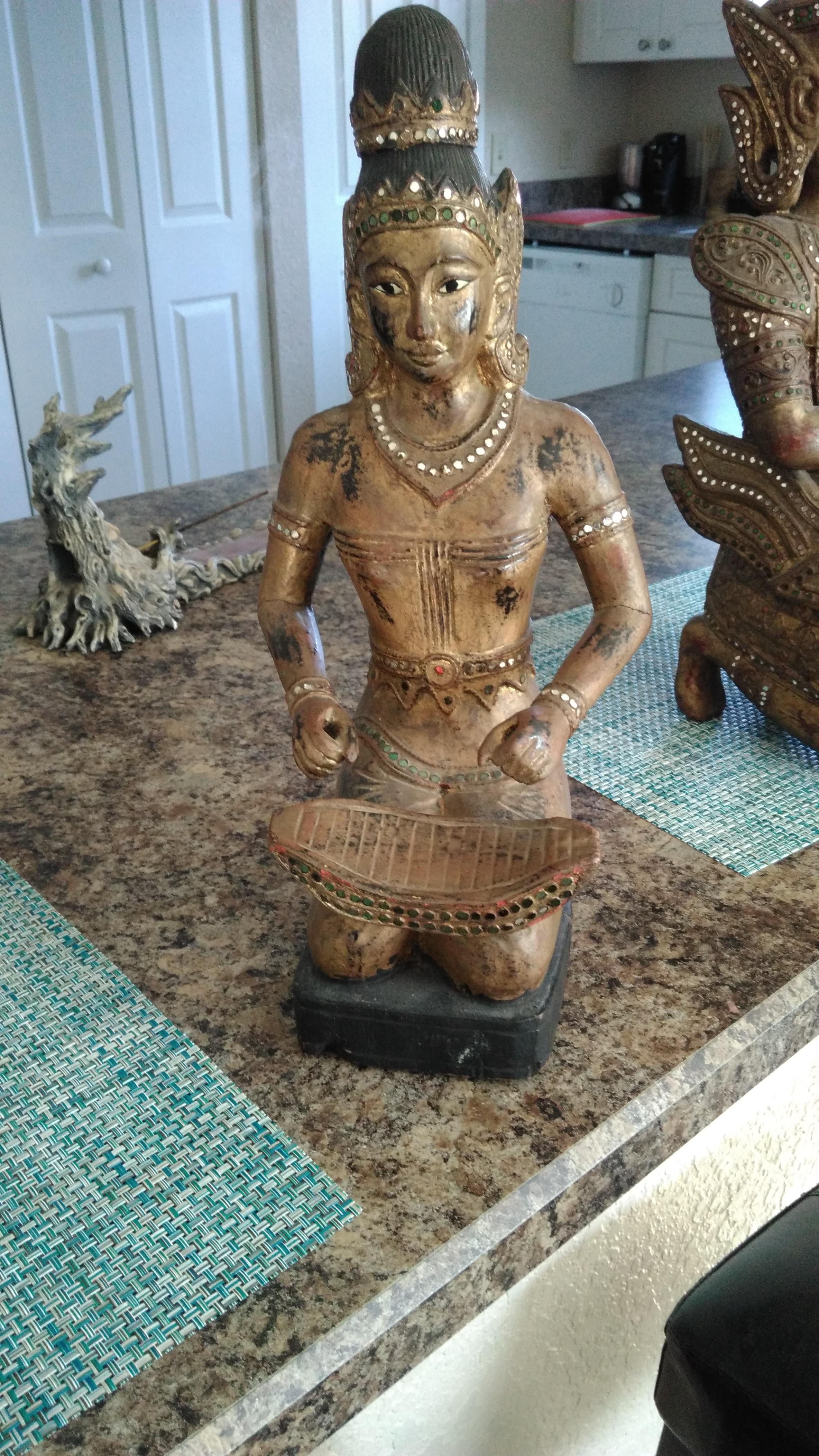 I bought 2 wood carved Thailand Buddhas one is missing a piece on its head and the other two wooden sticks on its hands. Both are heavy and I paid $40 dollars. I did find some tickets attached to the bottom of one.