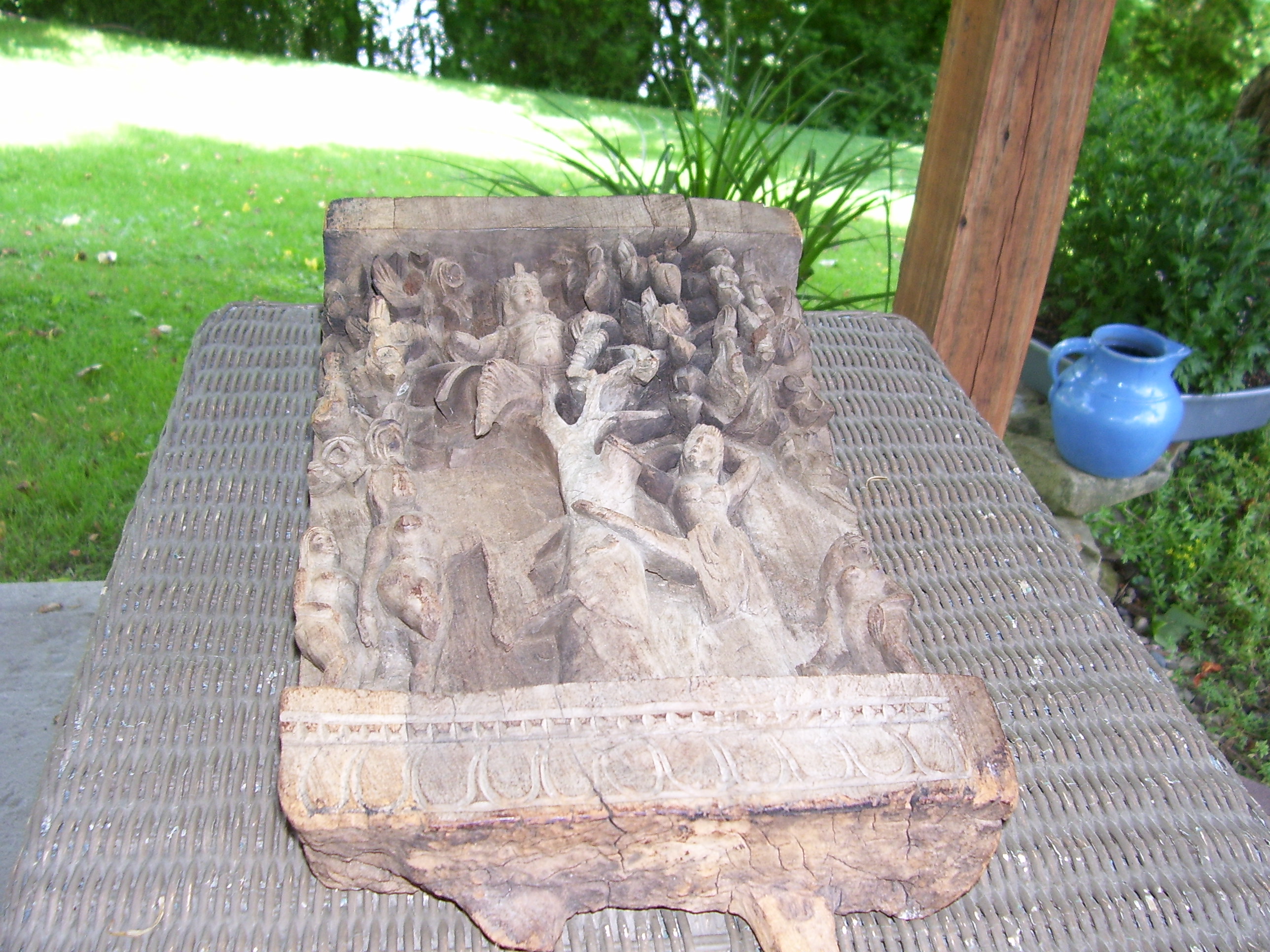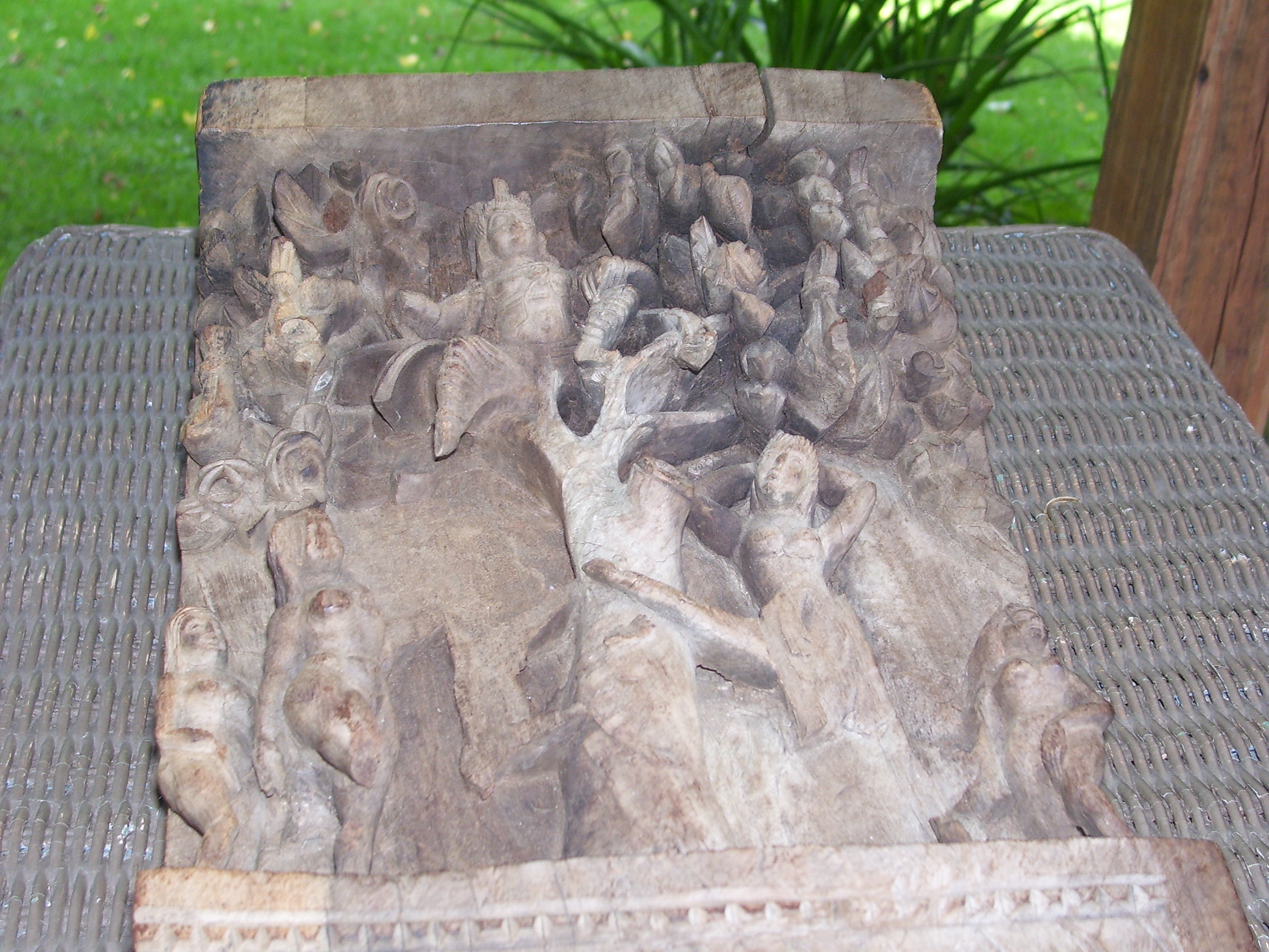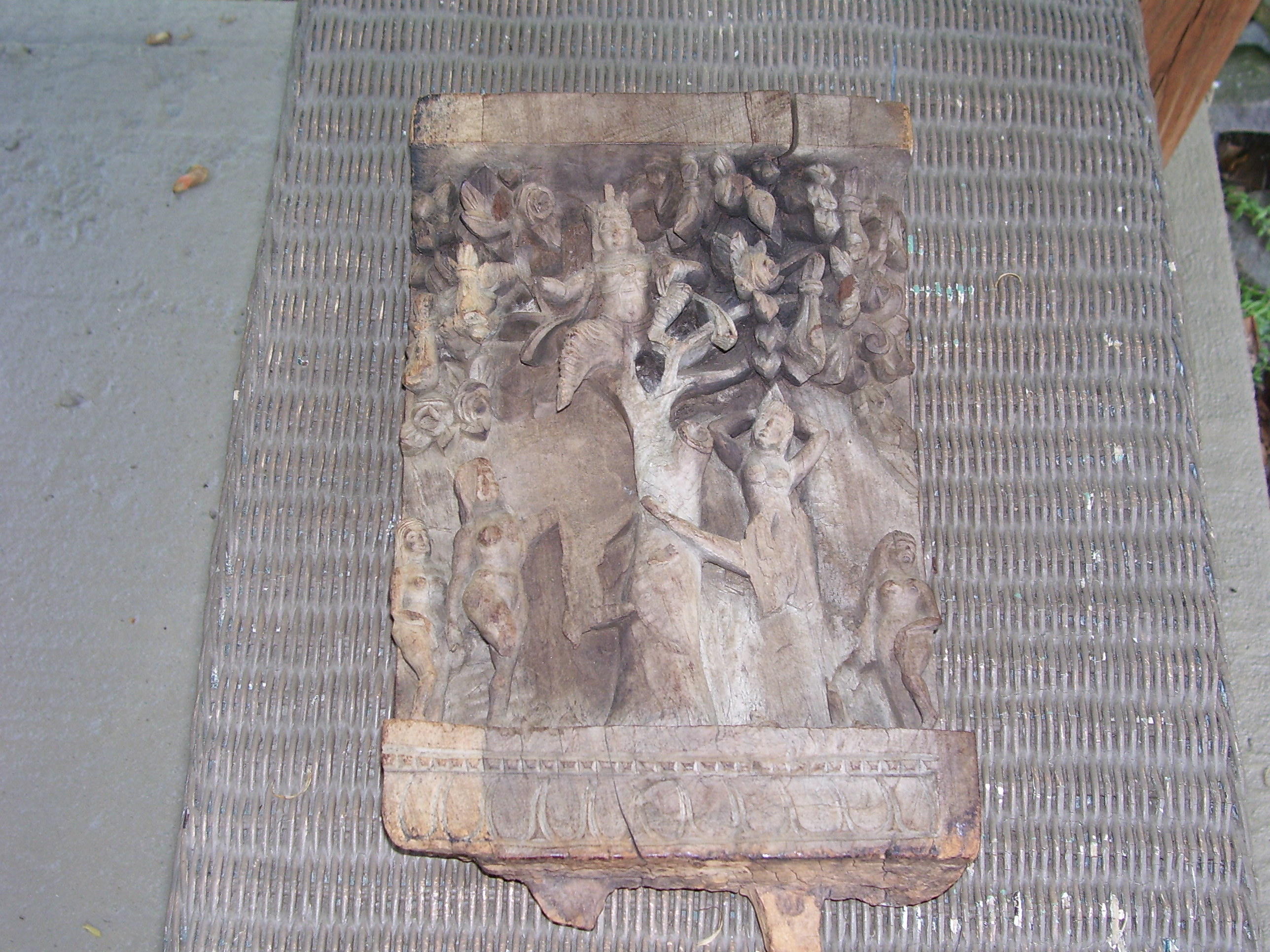 This is from an estate auction and had been in the family for many years. Some members put it back several generations and story has it that the grandfathers, grandfather had brought it from some other country where it had been handed down to him.The carving is from one solid piece of wood and has very detailed images of women standing by a tree with a godess? sitting in the upper branches surrounded by flowers. The bottom has a carved design.