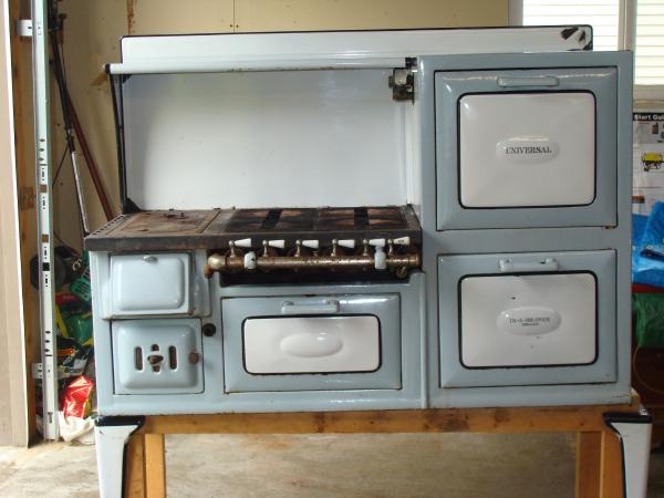 Cribben and Sexton wood/gas cook stove, Universal, serial number 2409-1TMRAB, manufactured in Chicago IL, UL approved, blue and white procelin on metal cast, four burner, oven with temperature control gauge, cooking and warming oven, front loading firewood, natural gas/propane fueled, all original parts, grates and drip pans, fulling functioning, with legs