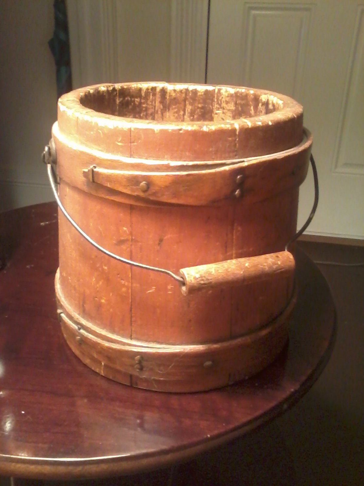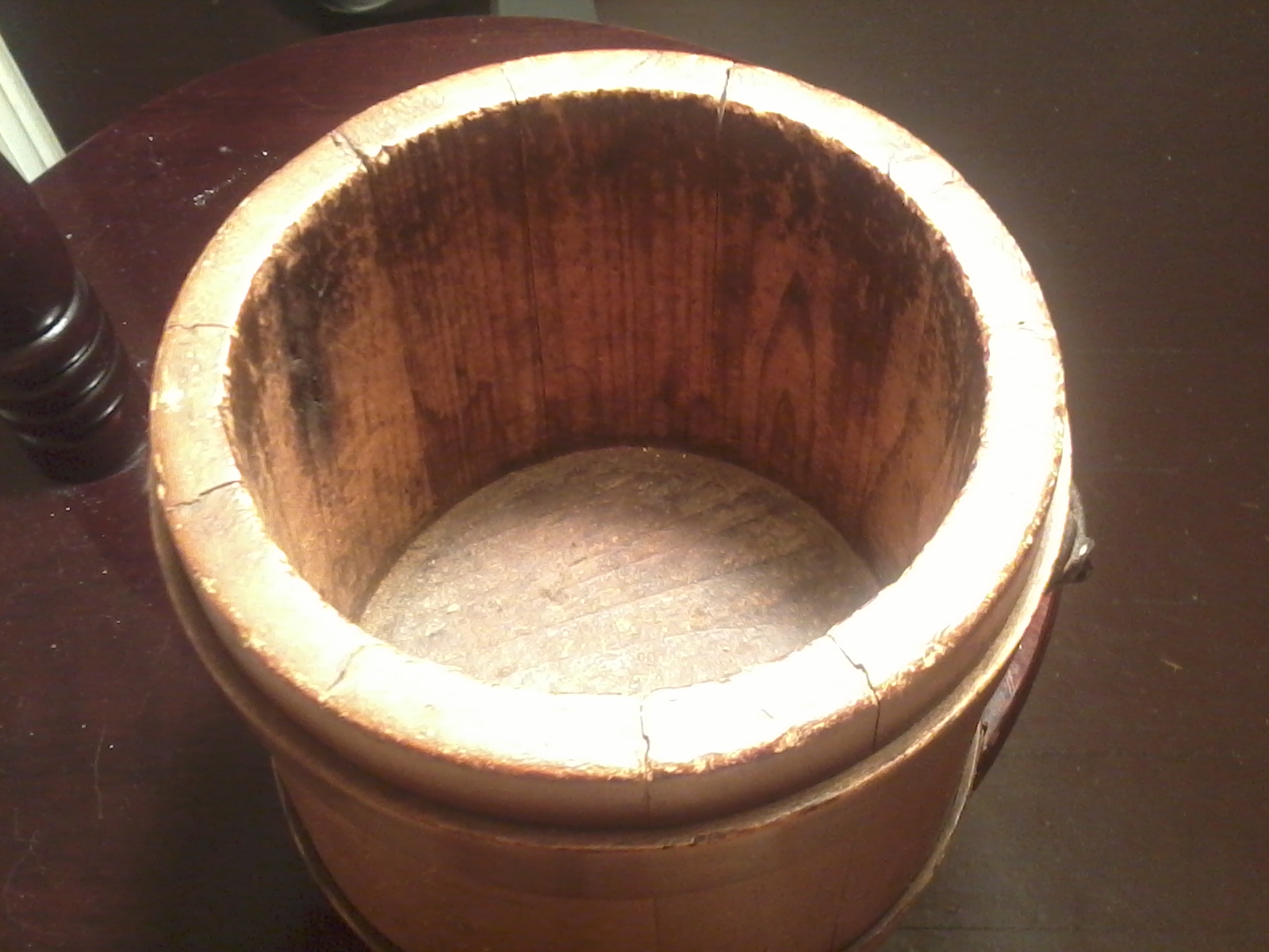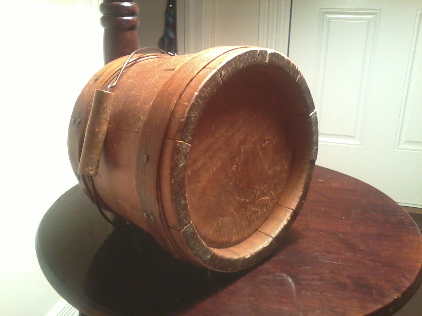 Wood sugar bucket with wood straps, wire and wood handle. Holds about 5 lbs. of sugar. Dark caramel colored wood. No markings.
