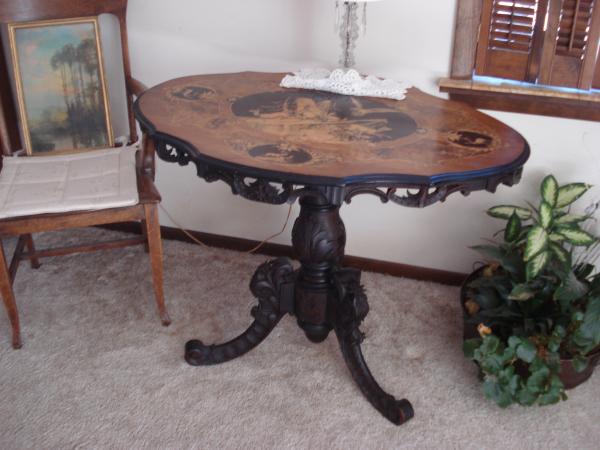 Mother noted that is was possibly purchased in Europe by her mother. I have no history on it other than that, and can't seem to find anything comparable to it. Not even sure how to describe it so I'm hoping you can help. Pictures are attached. I can't tell if the wildlife scene is painted on or is an inlay of some sort. Help! Thanks!!
