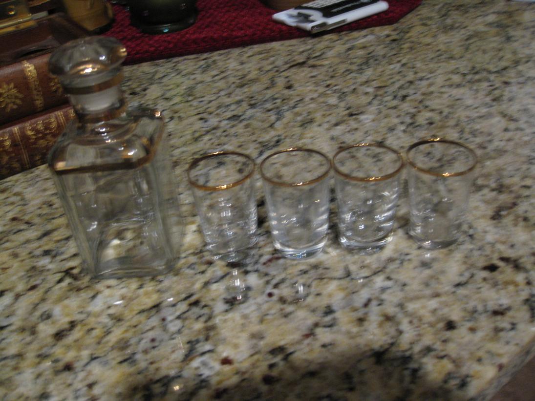 THIS IS VERY UNUSUAL IT LOOKS LIKE 4 STACKED BOOKS AND OPENS UP AND HAS A HINGE WITH A HOLDER FOR THE DECANTER AND 4 SHOT GLASSES WITH GOLD PLATED AROUND THE RIMS OF ALL.. MADE IN FRANCE. IT HAS A CROWN ON THE TOP OF THE STACK ALL HAVE NAMES ON EACH BOOK. TALLEST BOOK - VICTOR HUGO SA VIE SES EUVRES. 2ND BOOK-JEAN RICHEPEN MIARKA. 3RD- MOLIERE- OMEDIES 4TH-HISTOIRE- D'ANGLETFRR. EACH BOOK HAS DIFFERENT GOLD COLORED MARKINGS ON EACH BOOK.