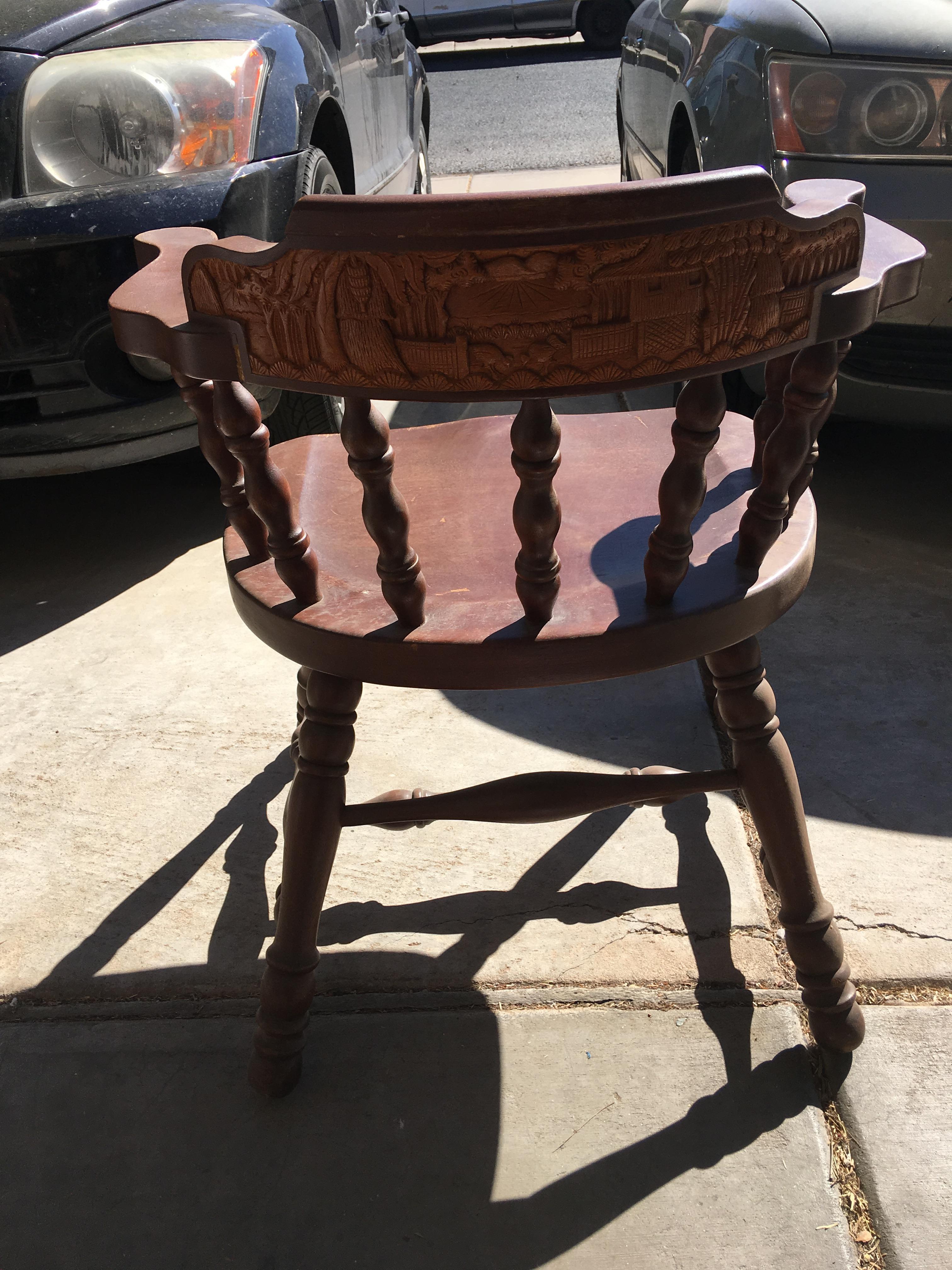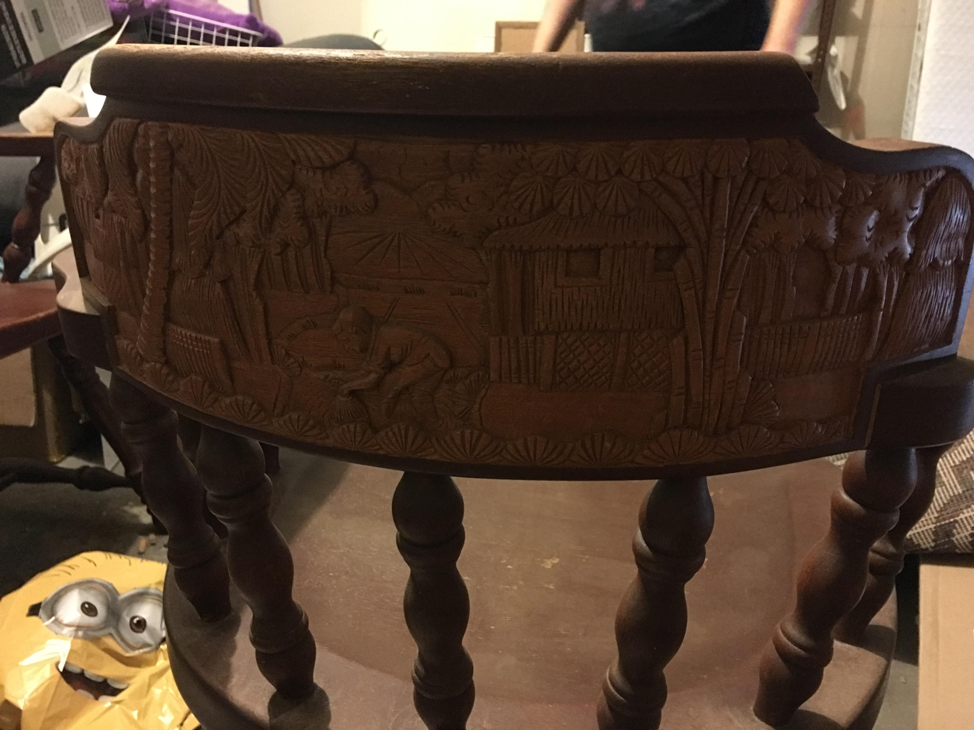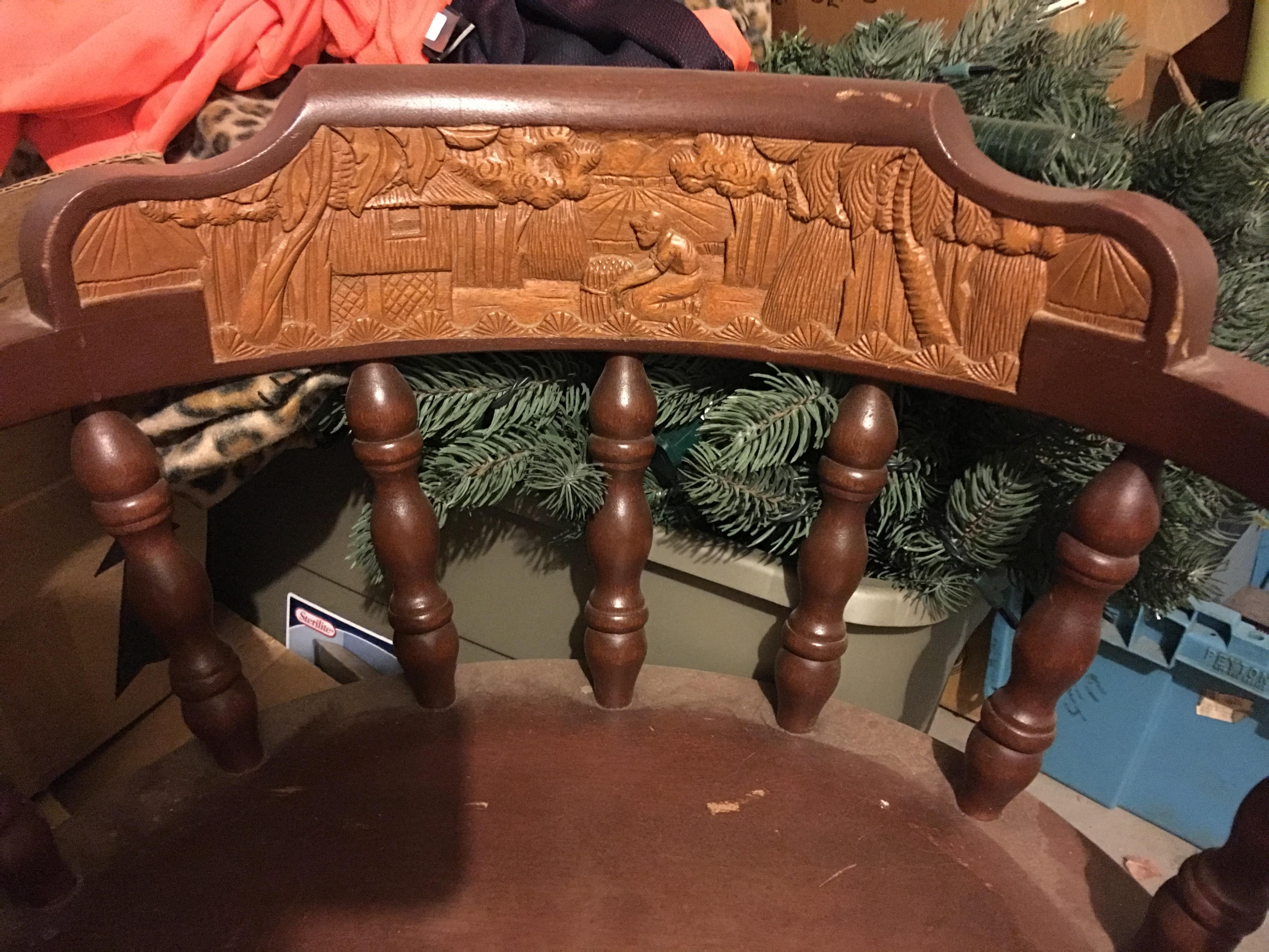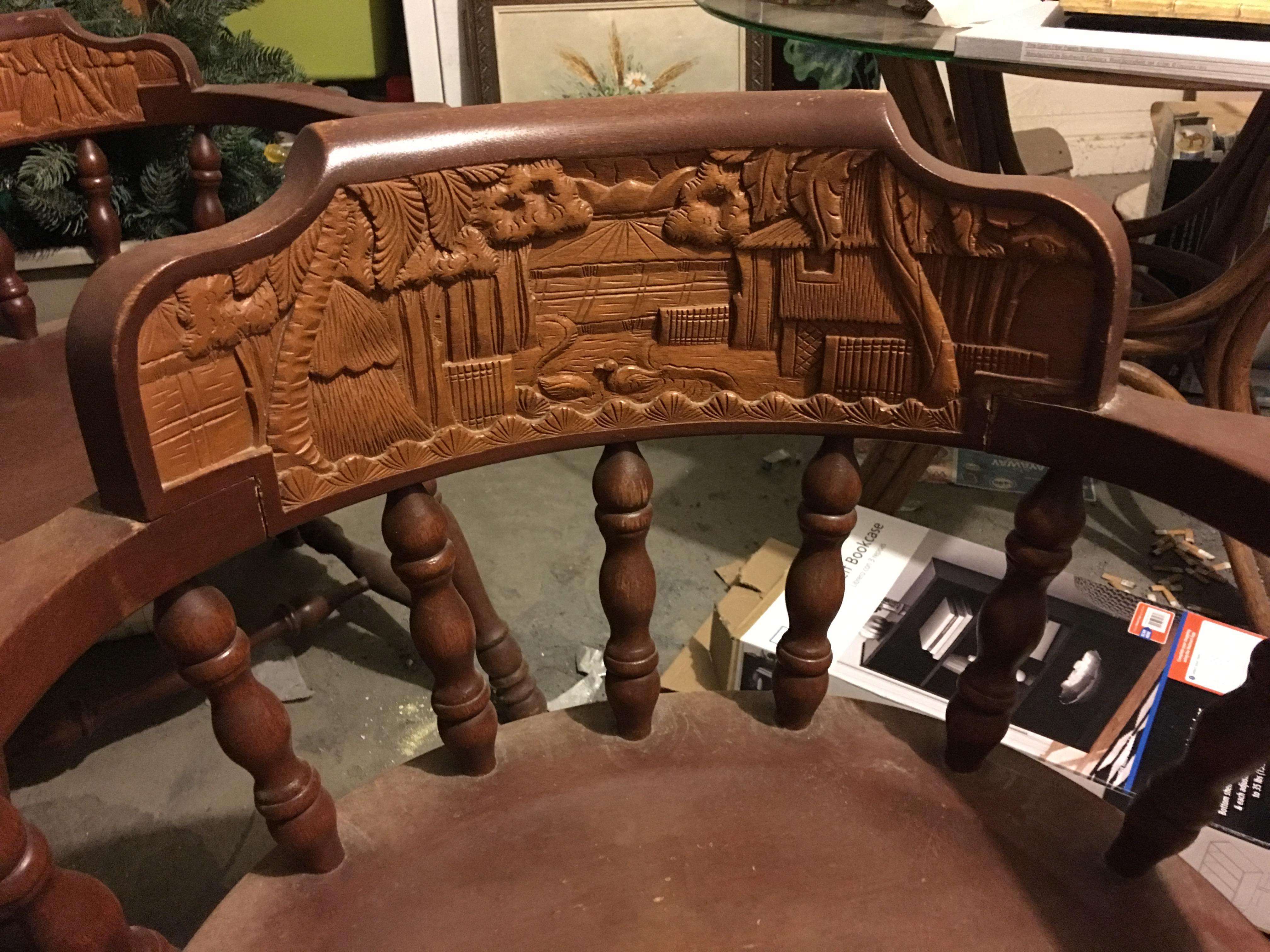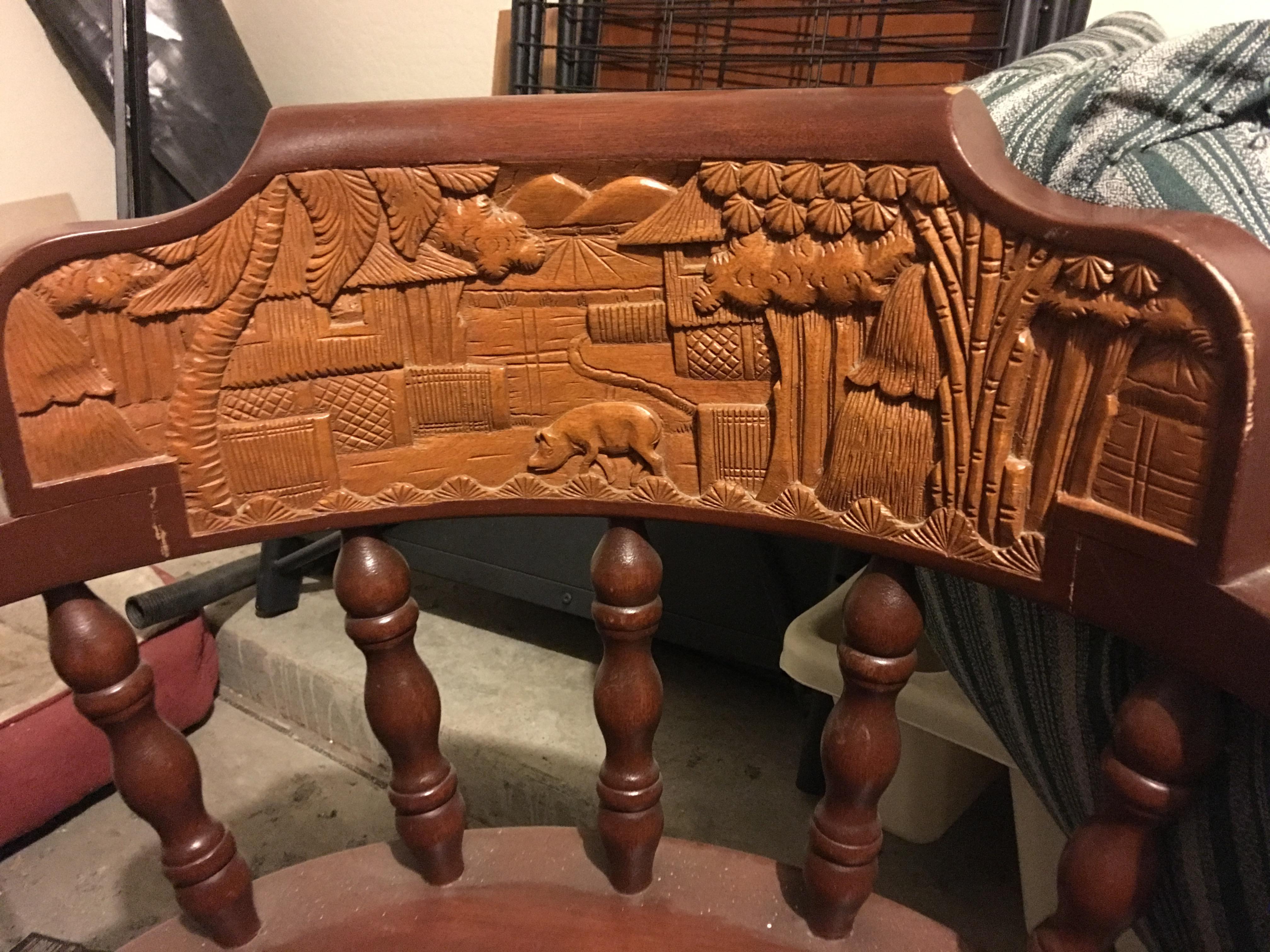 The history of these items has been lost, but the original owner is a collector of antiques. The chairs are some kind of heavy solid wood, seem to be hand carved. There are different hand carved scenes on the front and back of each chair. We are trying to ascertain the value so they can be sold to help with the elderly owners medical care.