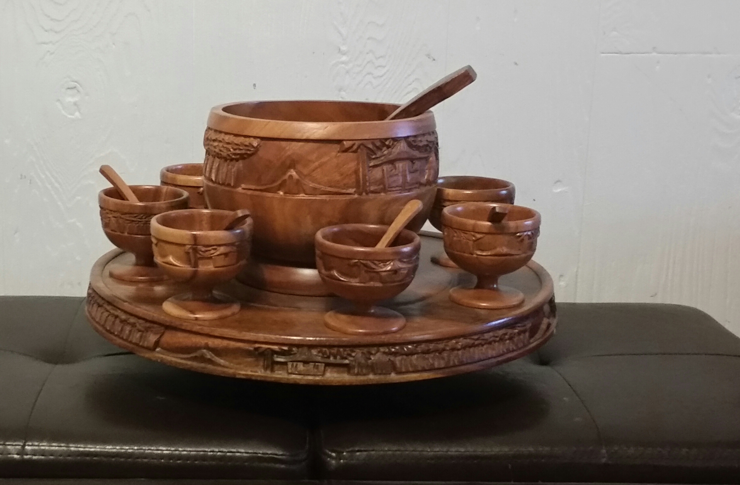 wooden bowl, cups & spoons