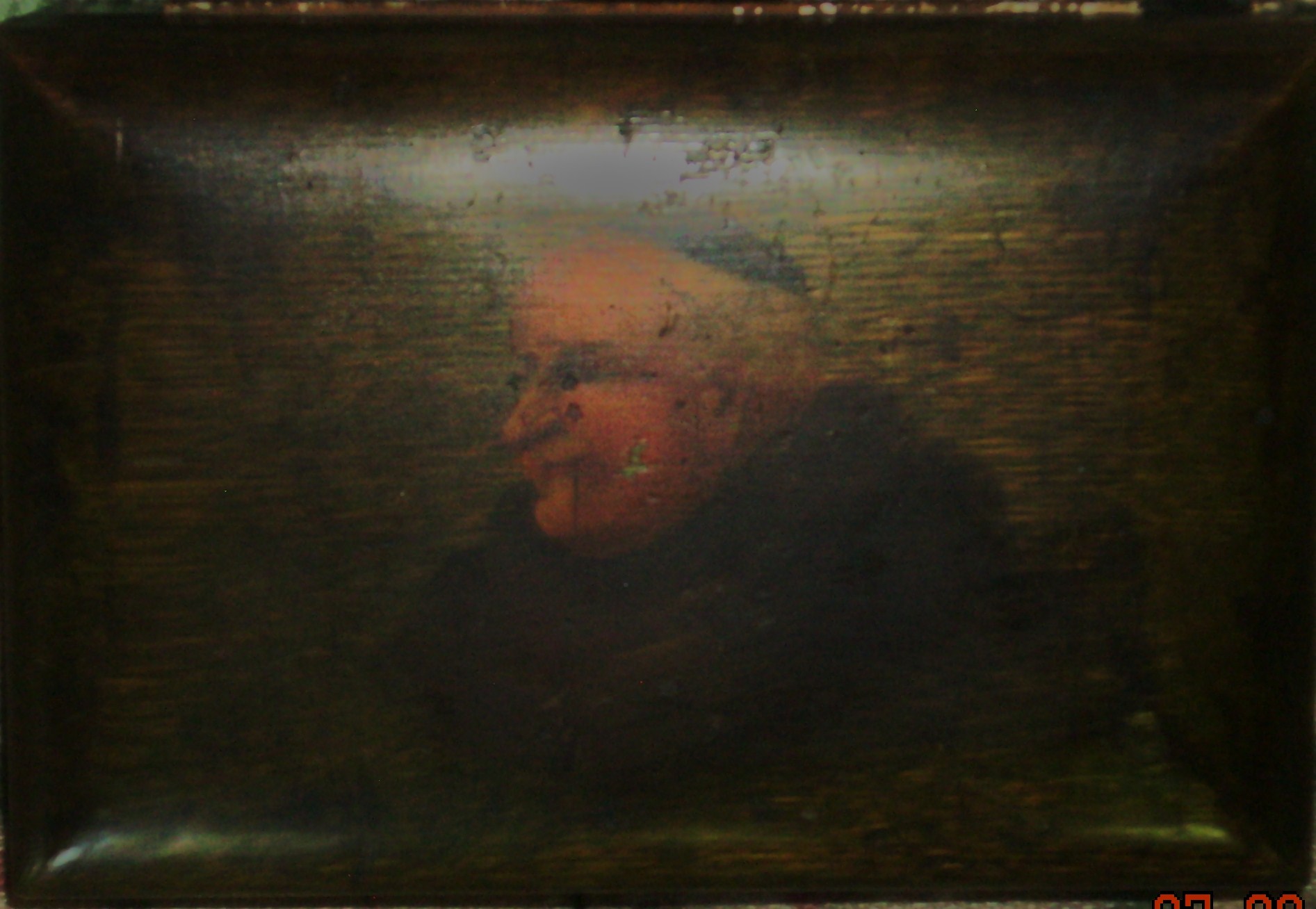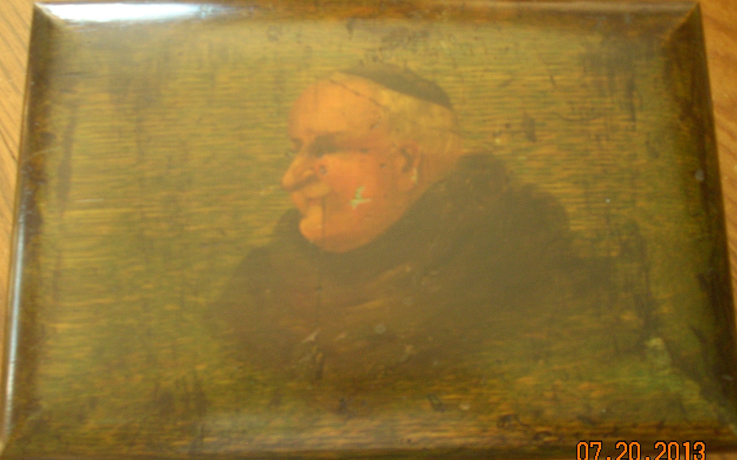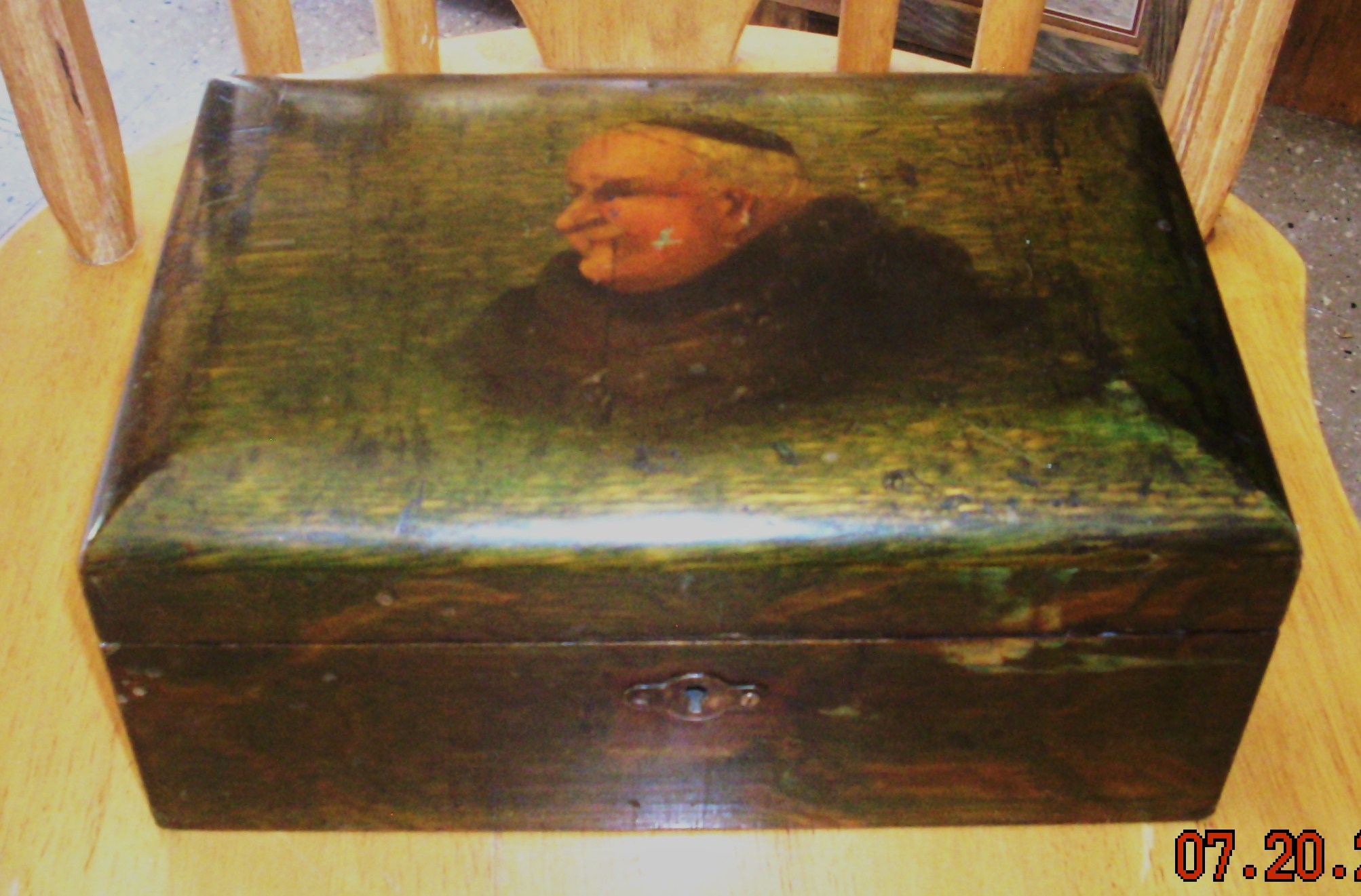 I got this old wooden box in 2005, it belonged to my grandma..It always and still does hold smoking pipes that were my grandfathers. I dont know if its a religious type keepsake box or what..It has a hand painted picture on top side, I've had people tell me the pope, but i believe its a monk. My grandma was a devoted Catholic her whole life, so thats why im leaning more towards a keepsake box for religious misc. I've tried finding anything online that closely resembles it, but have had no luck. It has no maker or numbers anywhere that i can see., the bottom is worn down to the wood, you can tell it was covered with a material, but thats long gone and the inside is tin, but im assuming had some cloth material or something in it..
