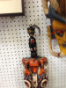 Free standing wooden mask, wooden.spears through a double headed carving, mask and other wooden.wall hangings, also candle holder.