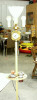 This is a carved wooden colonial lamp lighter light. The wood has one seam that runs vertically down the sides, I assume so they could insert the lighting apparatus. It appears to be hand carved, of a medium colored wood. The wood is carved to look like cobblestones under the man's feet, and he holds a metal object, I assume which is a replica of what they used to snuff out the lamps. The lamp has a branch that curves out to the side like a street lamp in the colonial days, which a little metal frame, and place for a small lightbulb. I do not know if that socket works since I don't have a lightbulb that fits it, but I assume it does since the main lamp socket works great. The cord and plug look original to me (not modern anyways). The shade is in practically perfect condition - it's a fake leather (kind of has a heavy paper feel) with what appears to be leather cord trimming it. The leather is broken in just one spot on the top. The bottom of the lamp is covered with a grey felt, that is mostly intact - a little dented/rubbed in one place. The lamp was in a smoker's home, so it smells strongly like smoke. See attached pics.