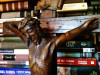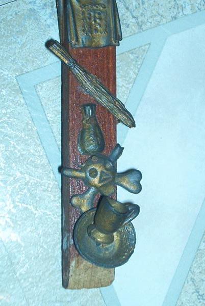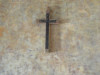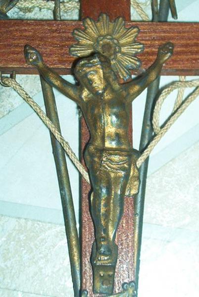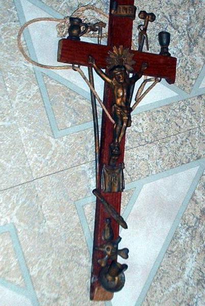 This is a wooden crucifix about 8 inches long and has a mahogony color stain on it. Attached to the crucifix are the symbols of Christ death on the cross. Christ has above his head a medallion and the letters "INRI", with a pitcher, cup, tools, sword, bottle, skulls and bones, cup and bowl, and a curtain with Jesus's face. These are all metal pieces attached to the cross with also metal rods behind the cross. Small nails are used to attach the metal pieces.