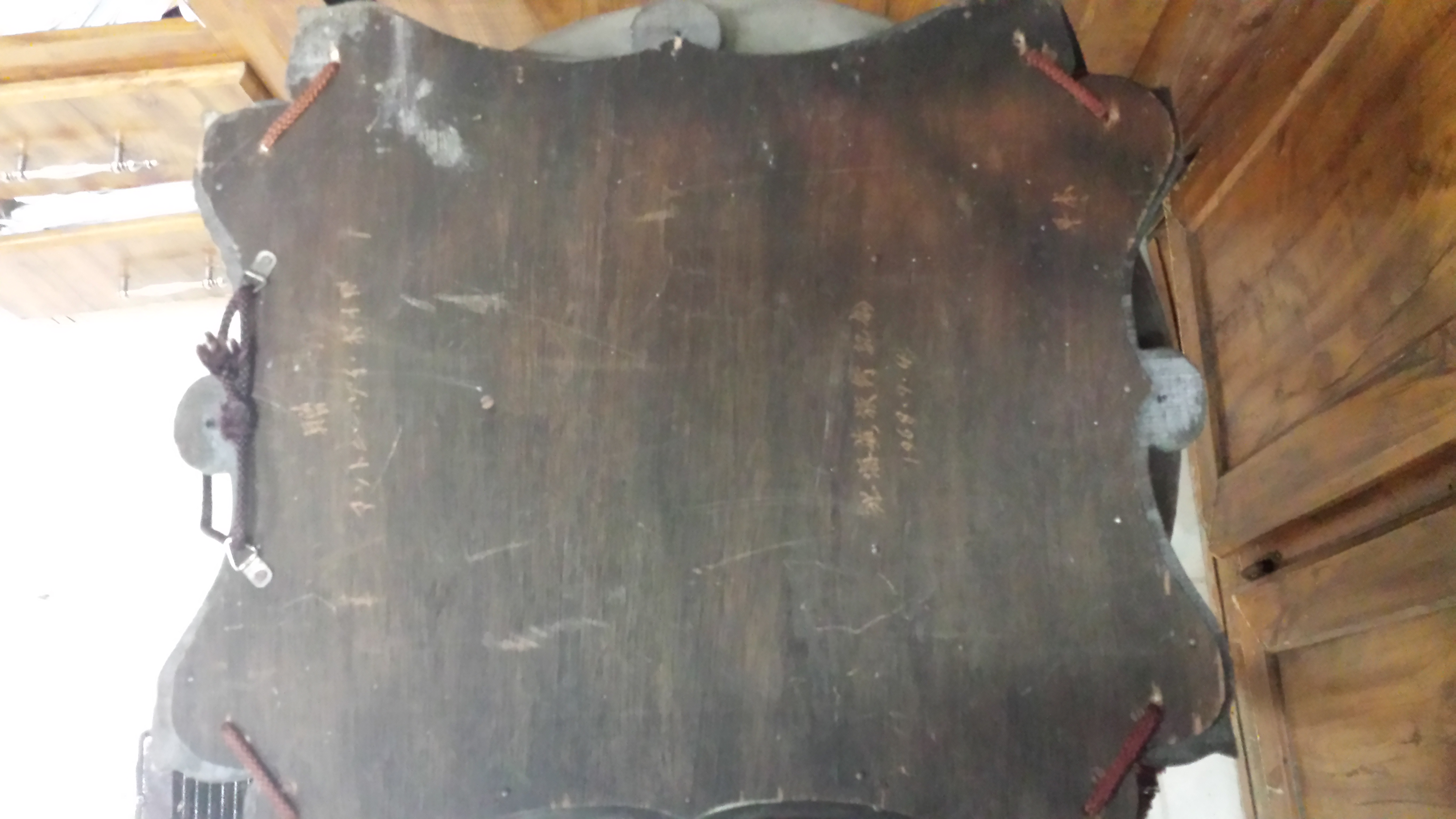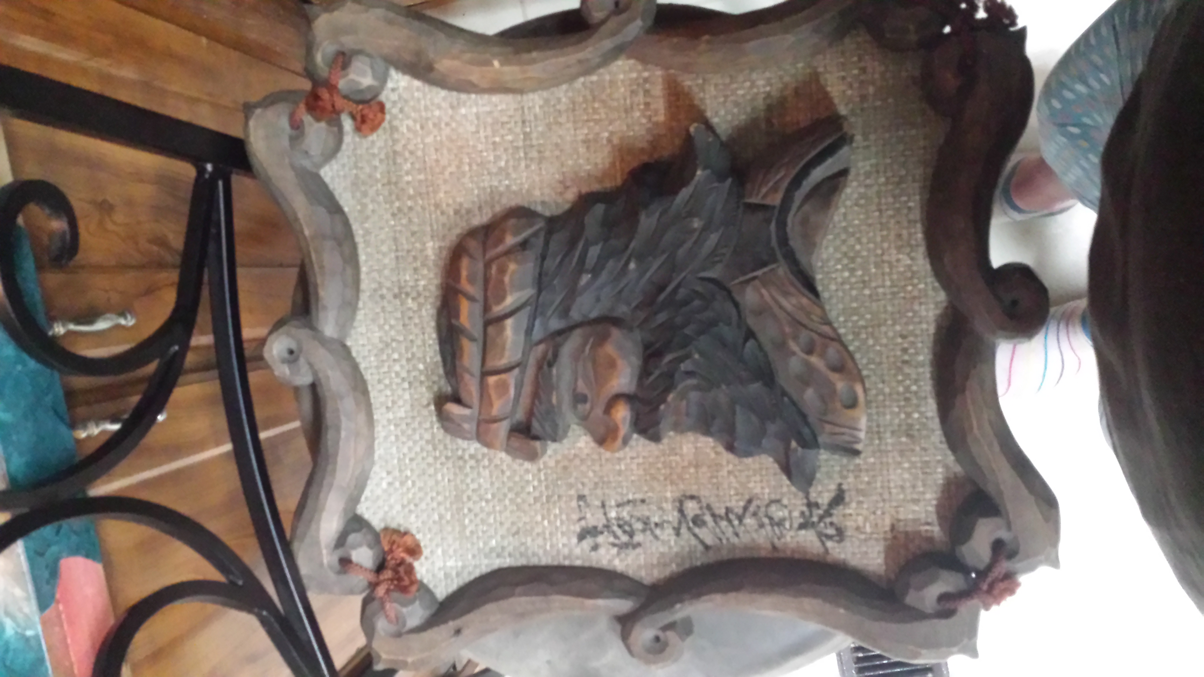 A wooden hand carved frame, with a background made of some type of straw like material and a hand carved wood silhouette 3d man's head. It has something wrote on side and back in another language and is dated 1968•7•4.