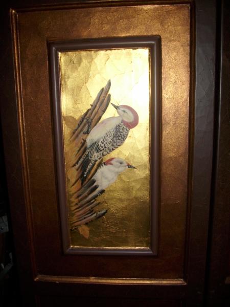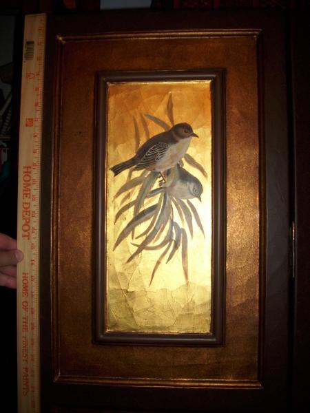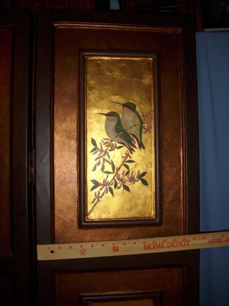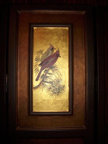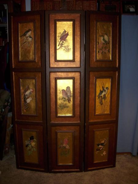 3 paneled wooden wall screen, each panel has 3 paintings on gold background. Each painted features a male and female of different American birds.