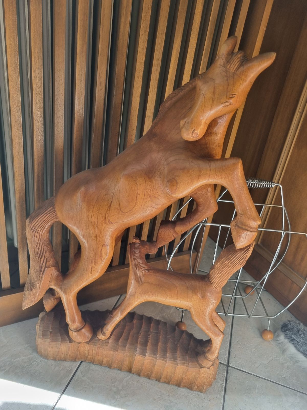 Collector Appeal: Collectors value wooden animal sculptures for their artistic expression and craftsmanship. The appeal lies in their ability to capture the beauty and spirit of the animals they depict. Additionally, the rarity of well-crafted pieces like this one, especially those that feature both a horse and foal, adds to their desirability in the market.