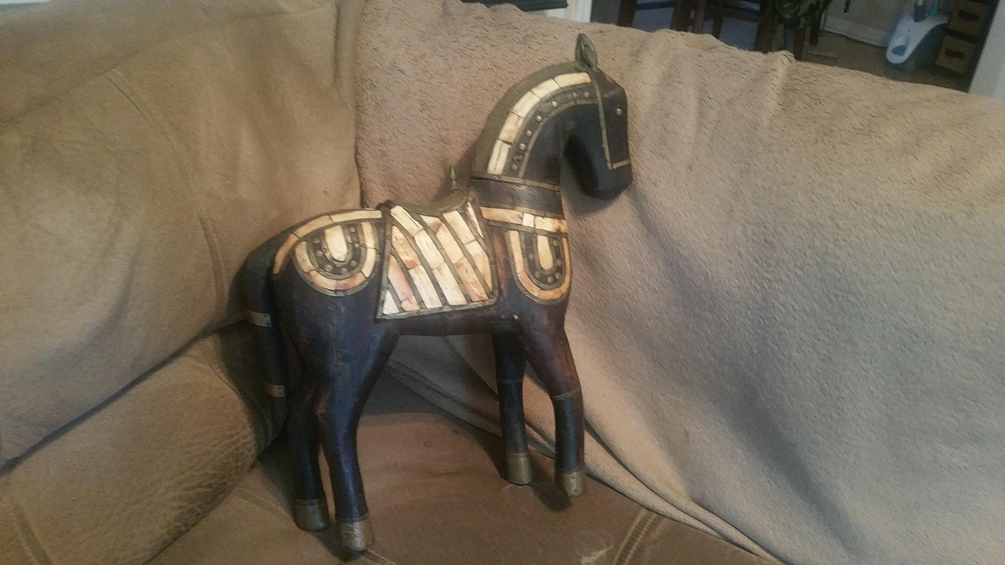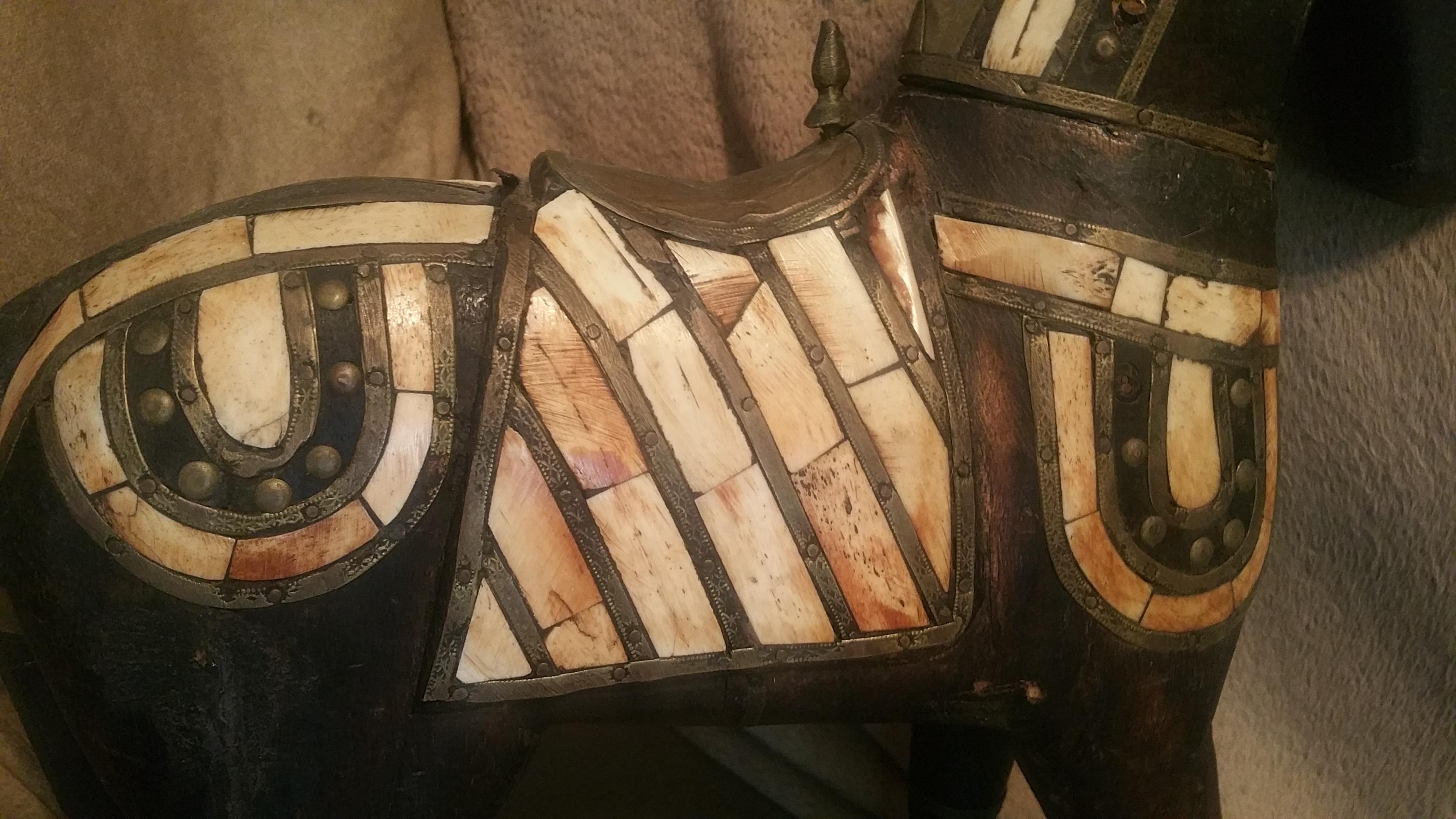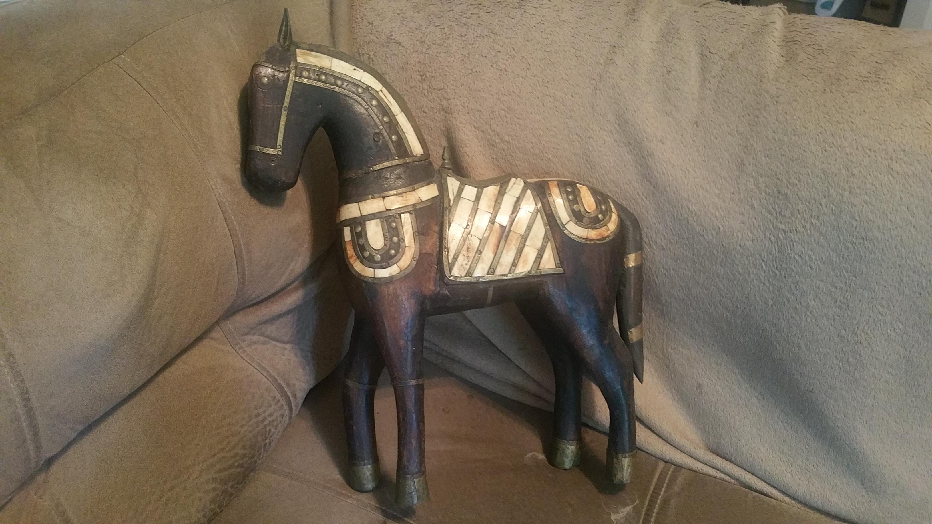 About 12" tall and 12" long. Weighs about 2lbs. The horse has what I believe to be ivory inlays and bronze pieces. The ears, saddle, hooves and other accents are bronze. It was an item in a storage locker that was bought in south Florida. Their are no markings to identify it by maker or country of origin.