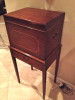 This is a wooden buffet with hutch. Mirror and small shelf at back pf buffet. Hutch has three doors. Center door is intricately carved and features a couple dancing outside while a man plays some kind of flute next to them (he is sitting on what appears to be a barrel). The bottom half has two large doors and shelves inside. All doors feature pretty gold-toned (maybe brass) decorative locks, and we have the key that fits all of them.
