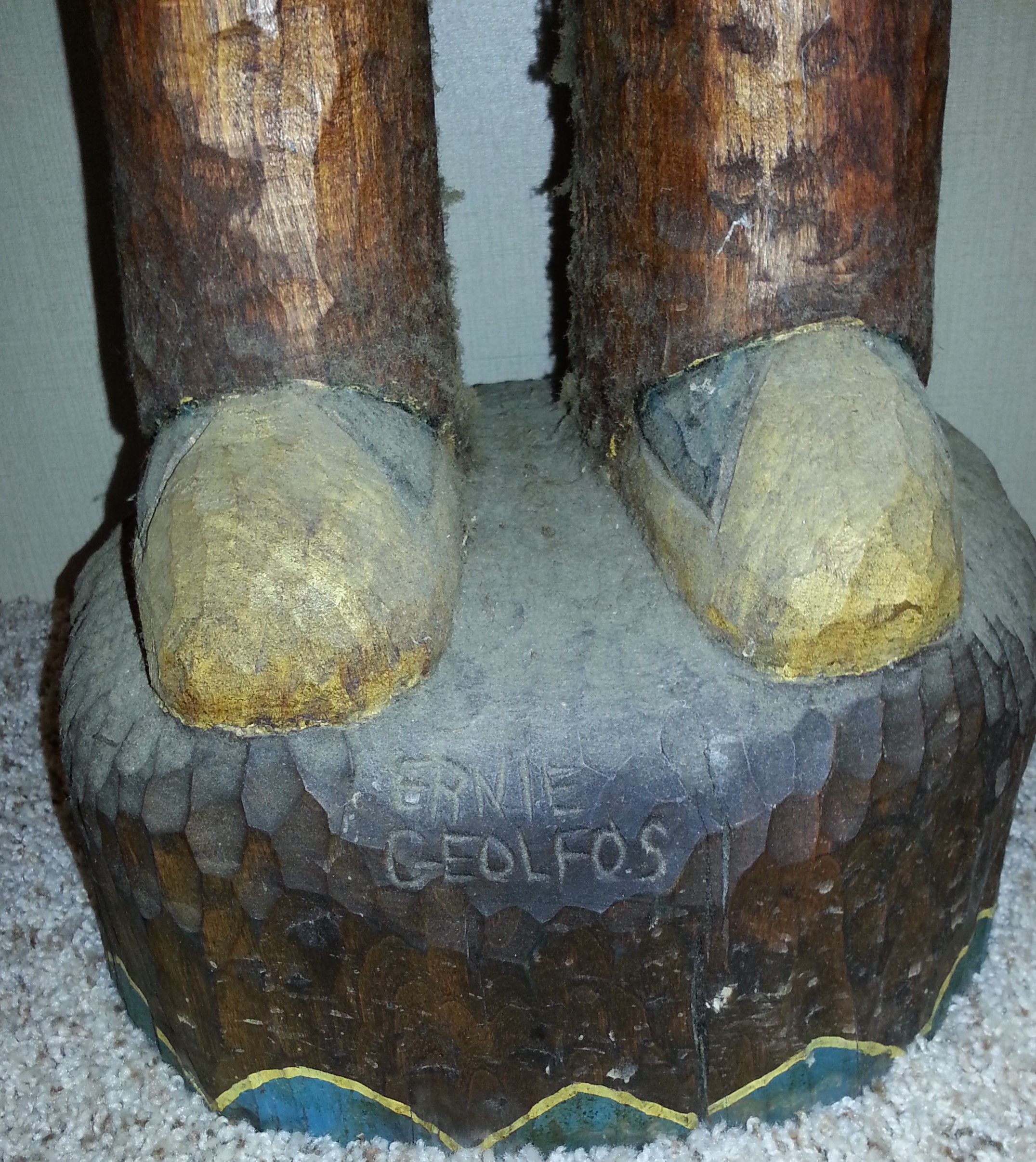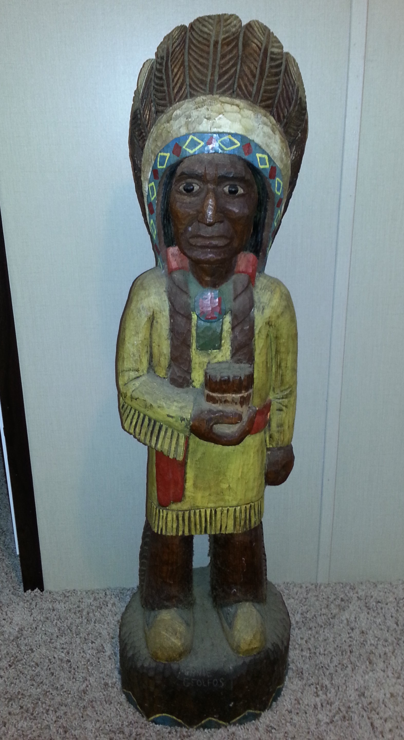 Wooden Indian statue by Ernie Geolfos. Not sure how old it is.