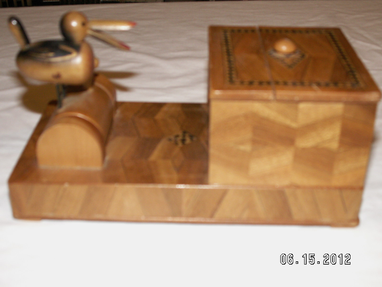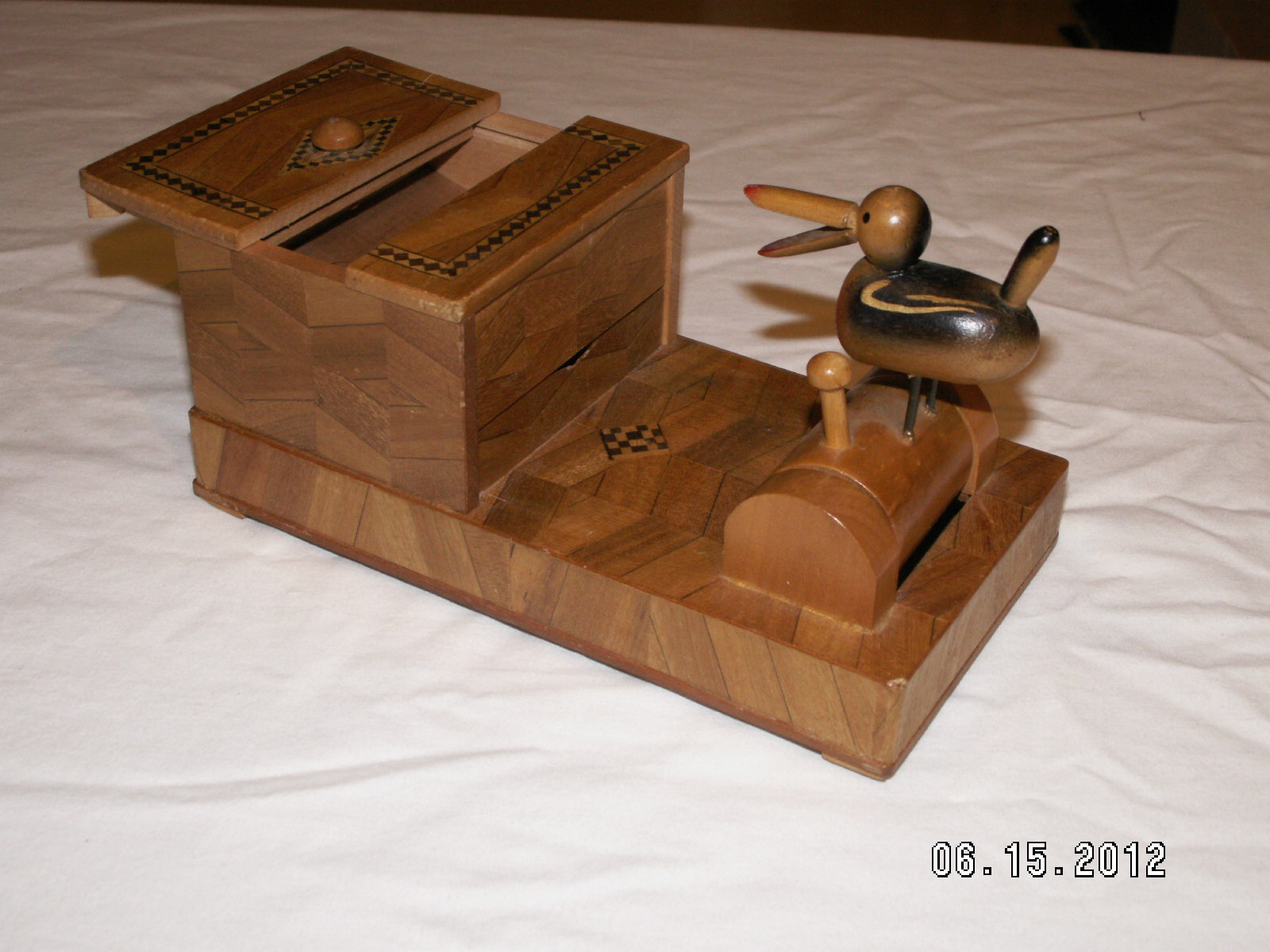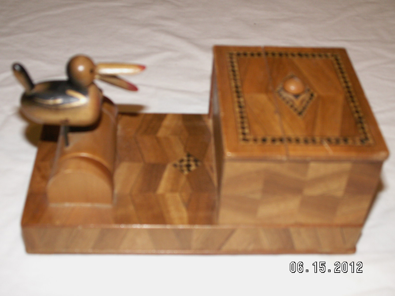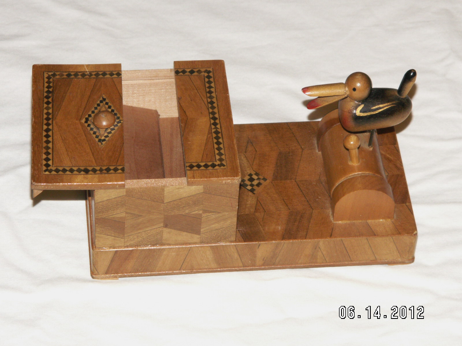 Very unique jewelry box with a movable bird. Not sure who made it and when, but very unique craftsmanship.