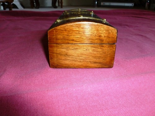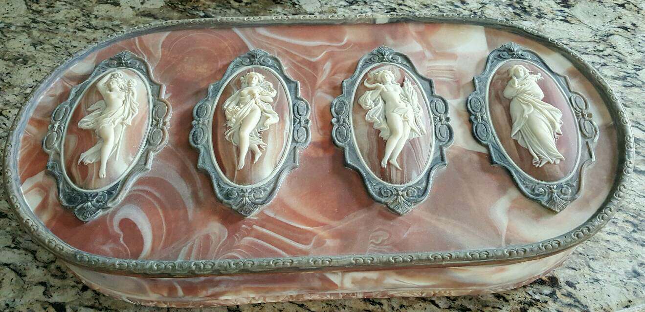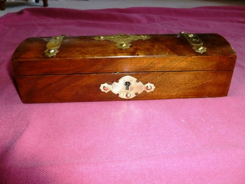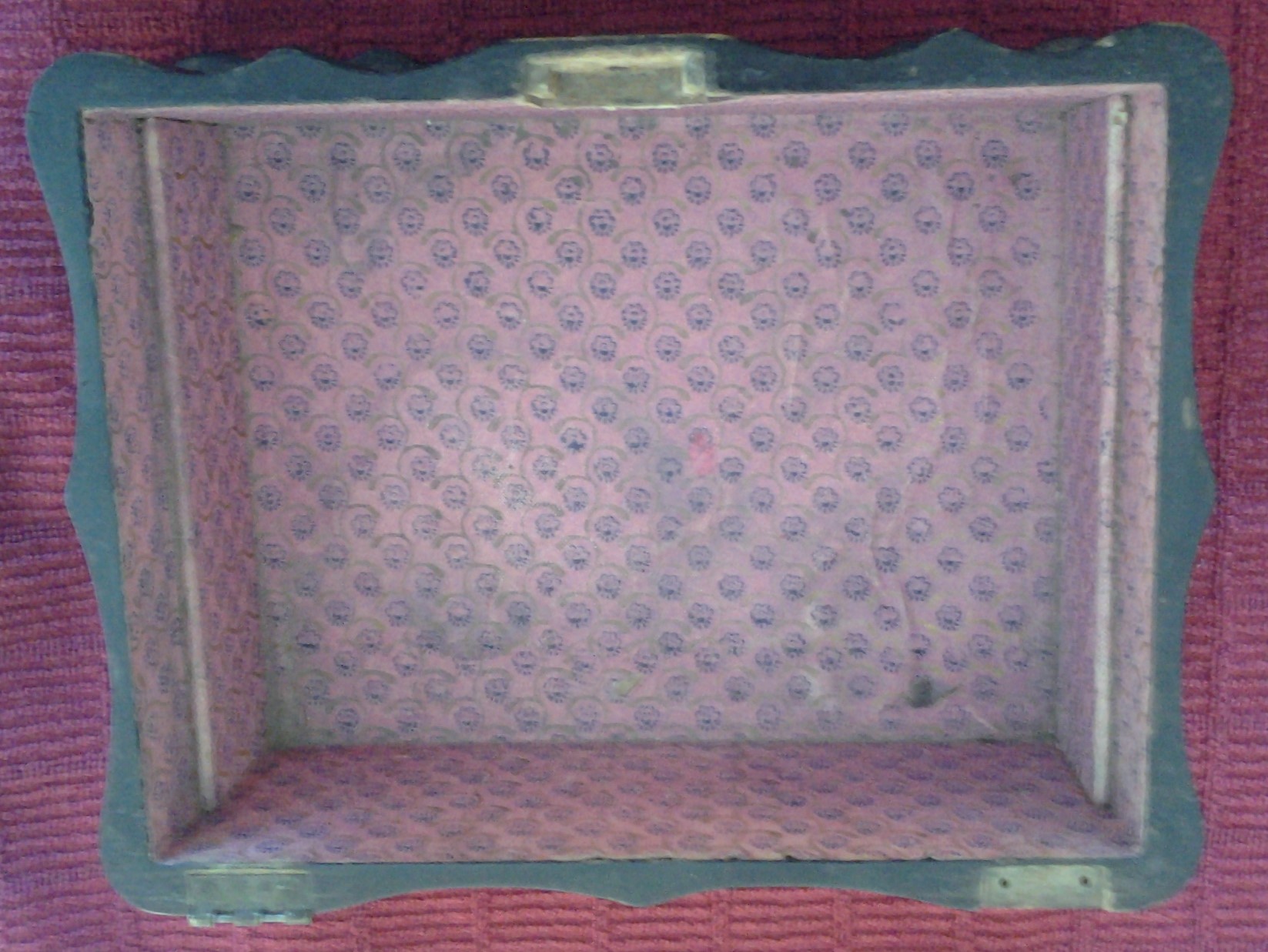 Antique Wooden Jewelry Box painted black with mother of pearl inlay design on top of lid.