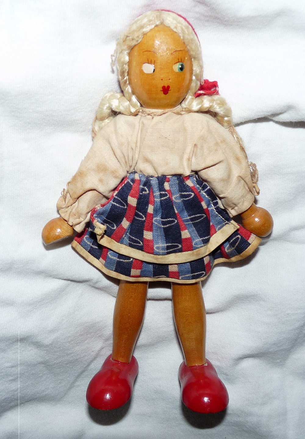 Wooden doll has painted face that has an eye missing. Painted eyelashes, eyebrows and heart lips with a line through them. She has blonde baraids with a red bandana. The white shirt is very stained and her apron and skirt have wear. Her arms and legs move. Her white under clothes are sewn together and her hands are round and flat on one side. Her red pained wood shoes are large & bulky.