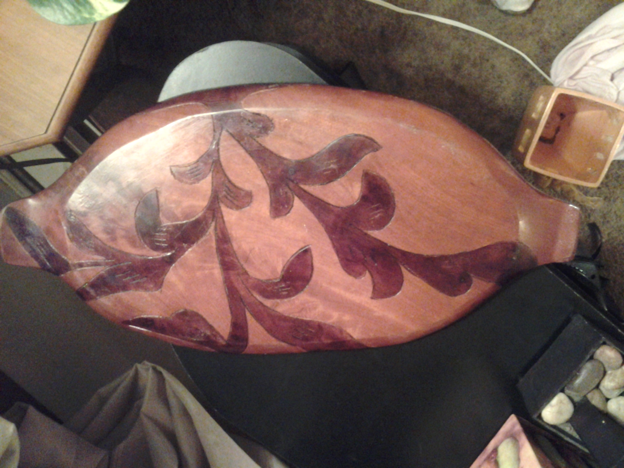 wooden oval serving tray with 1 inch lip. who handles, 1 with the image of a leaf eatched on handle. other handle has image of bird etched on it. try anglish etching around the lip of tray.in center of tray there is an etched design of a fish and a flower. leafy plant-like etching on back of tray.
