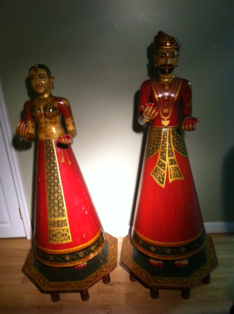 Two wooden statues, hand painted standing on a platform. The male is 55'' tall and has nicks and scratches but is otherwise in good shape. minor repairs to the base. The female is 50'' tall and has minor repairs to the base and has damage to two fingers on the left hand with one missing and repairs made. Nicks and scratches but otherwise in good shape. Guessing on Pakistan only because i saw a similar smaller statue online.