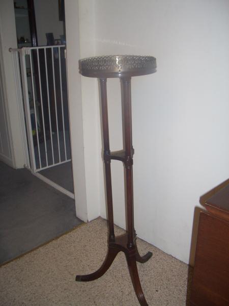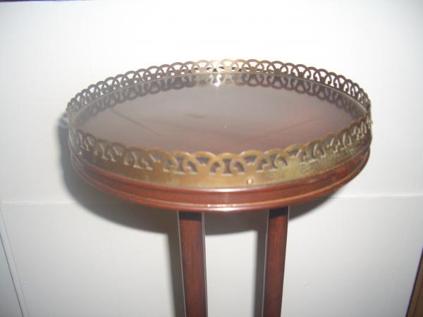 41" Tall possibly mahogany pedestal stand with decorative metal rim on round top and metal on the feet, Three feet with carved top, three rails reaching top with little center shelf
