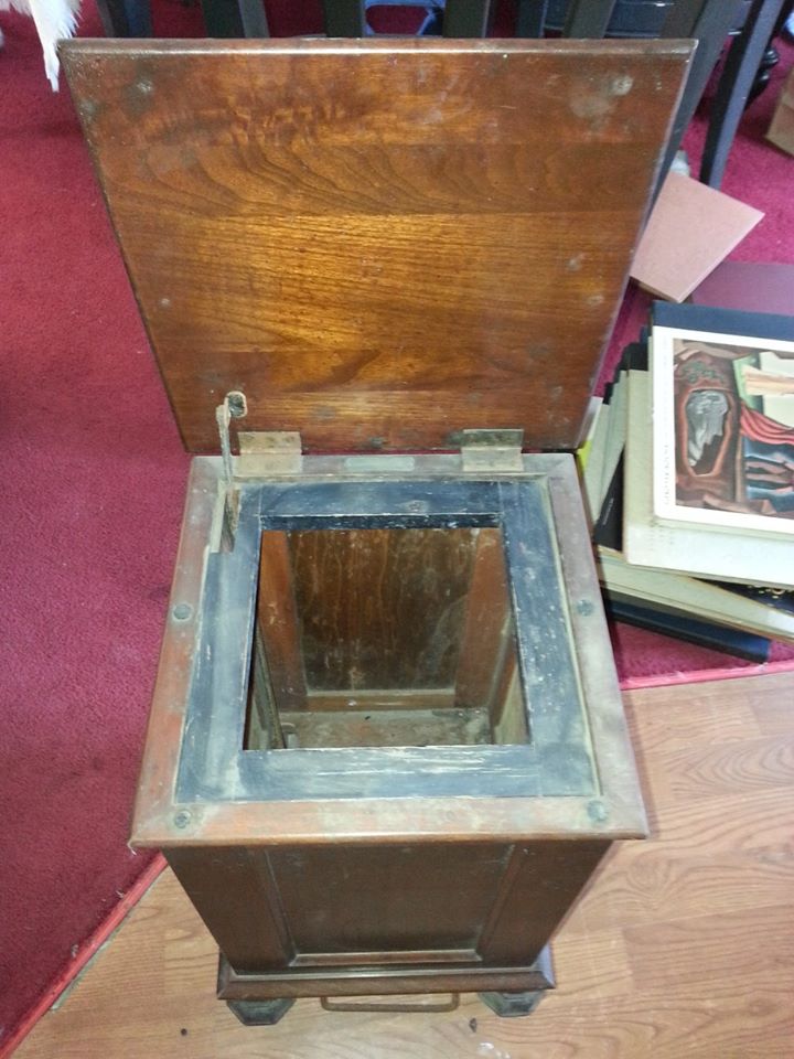 This wooden bin is 23" high x 12" wide x 12" deep. It has a foot pedal that opens and closes the top. The black rim within this piece can be removed. The tag on it read Hamilton Mfg. Co. Rahway, NJ with a number on it 9250-M25289. I seriously don't know what it is. My guess would be some sort of potato bin or a trash bin. Help?