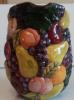 I have a dark wooden rocking chair that has a painted fruit design on the headrest. It is in good condition and has been in my family for at least 40 years. There are only minor dings and wear to the front of the rockers and arm rests.