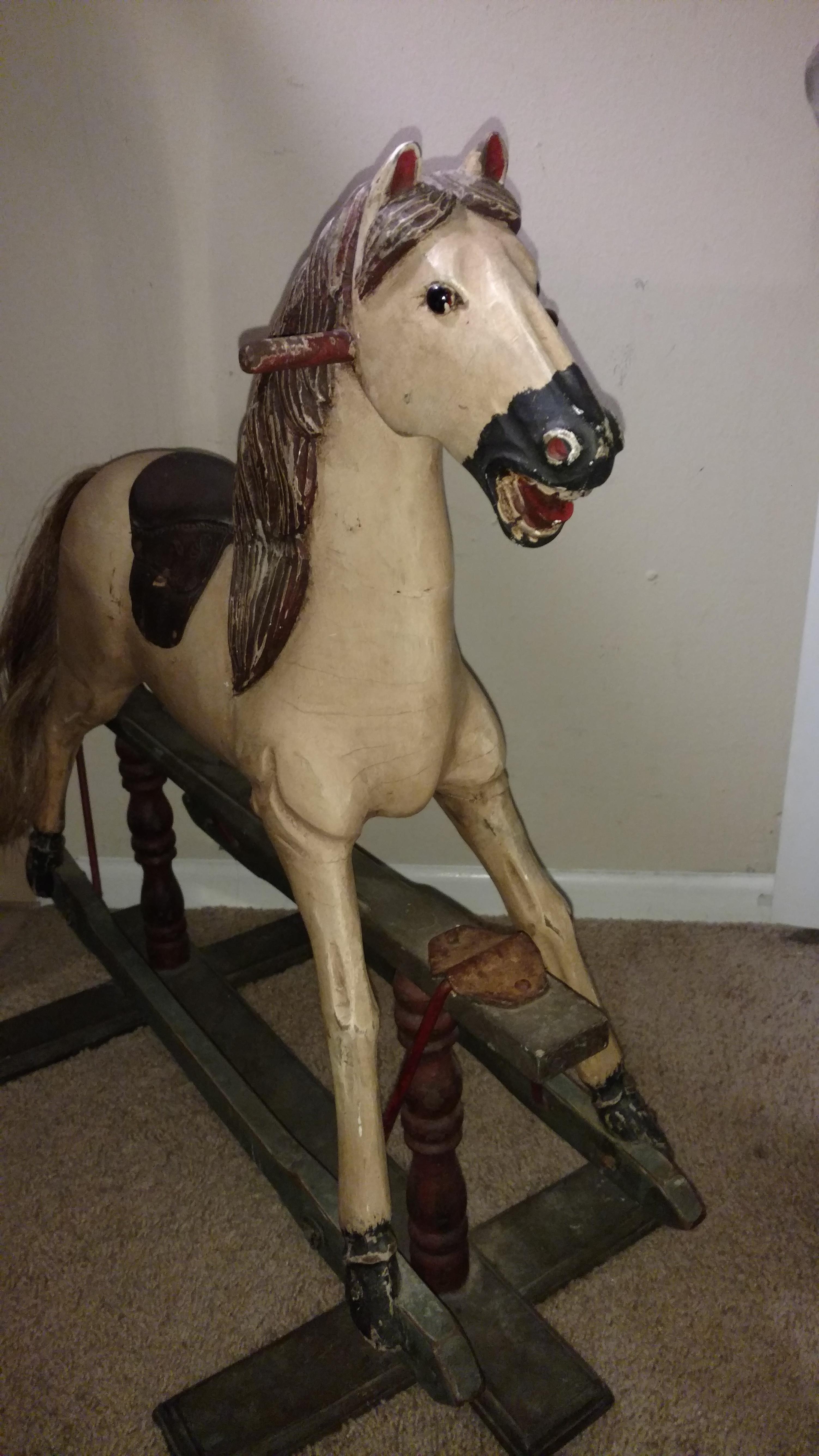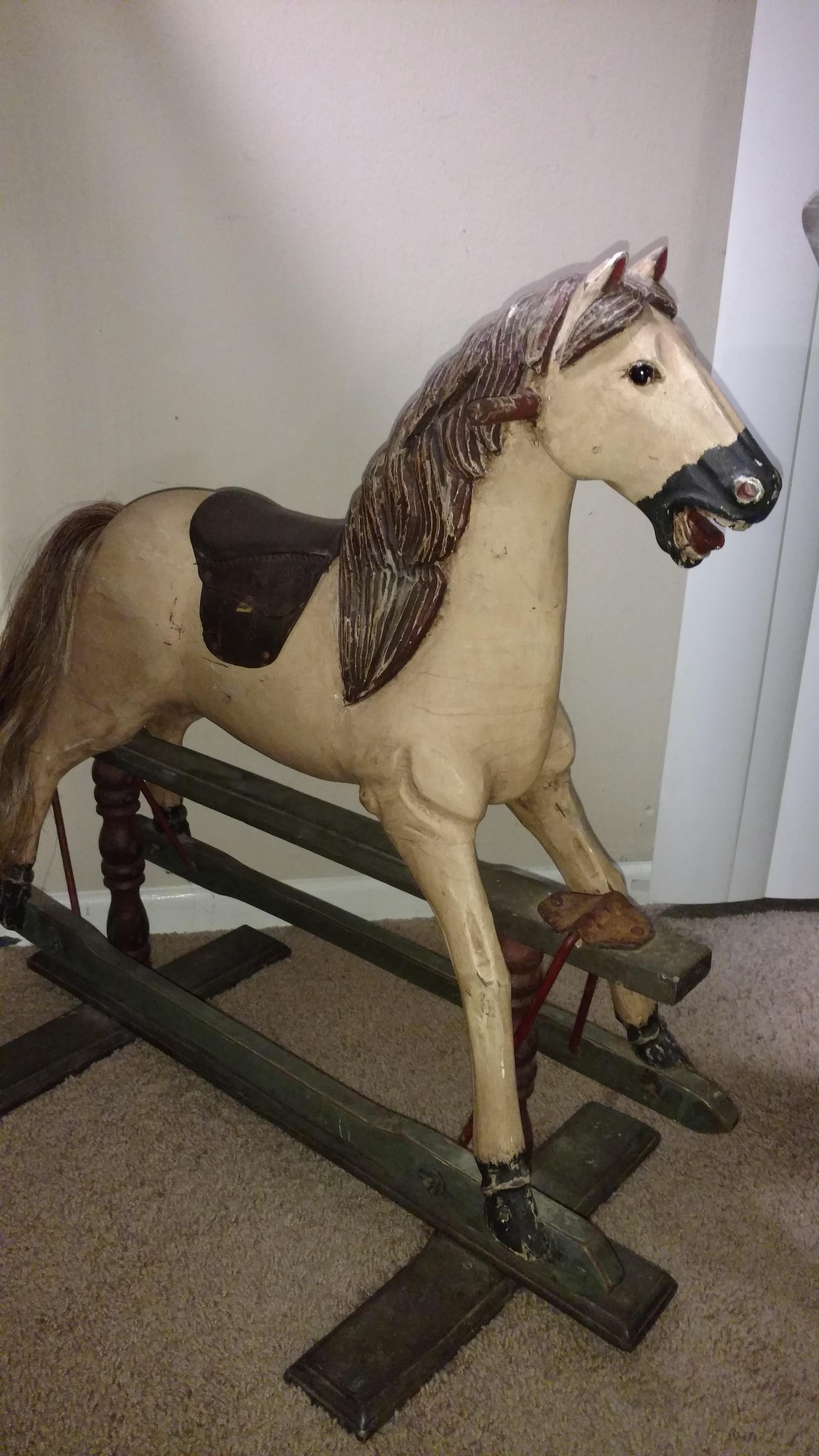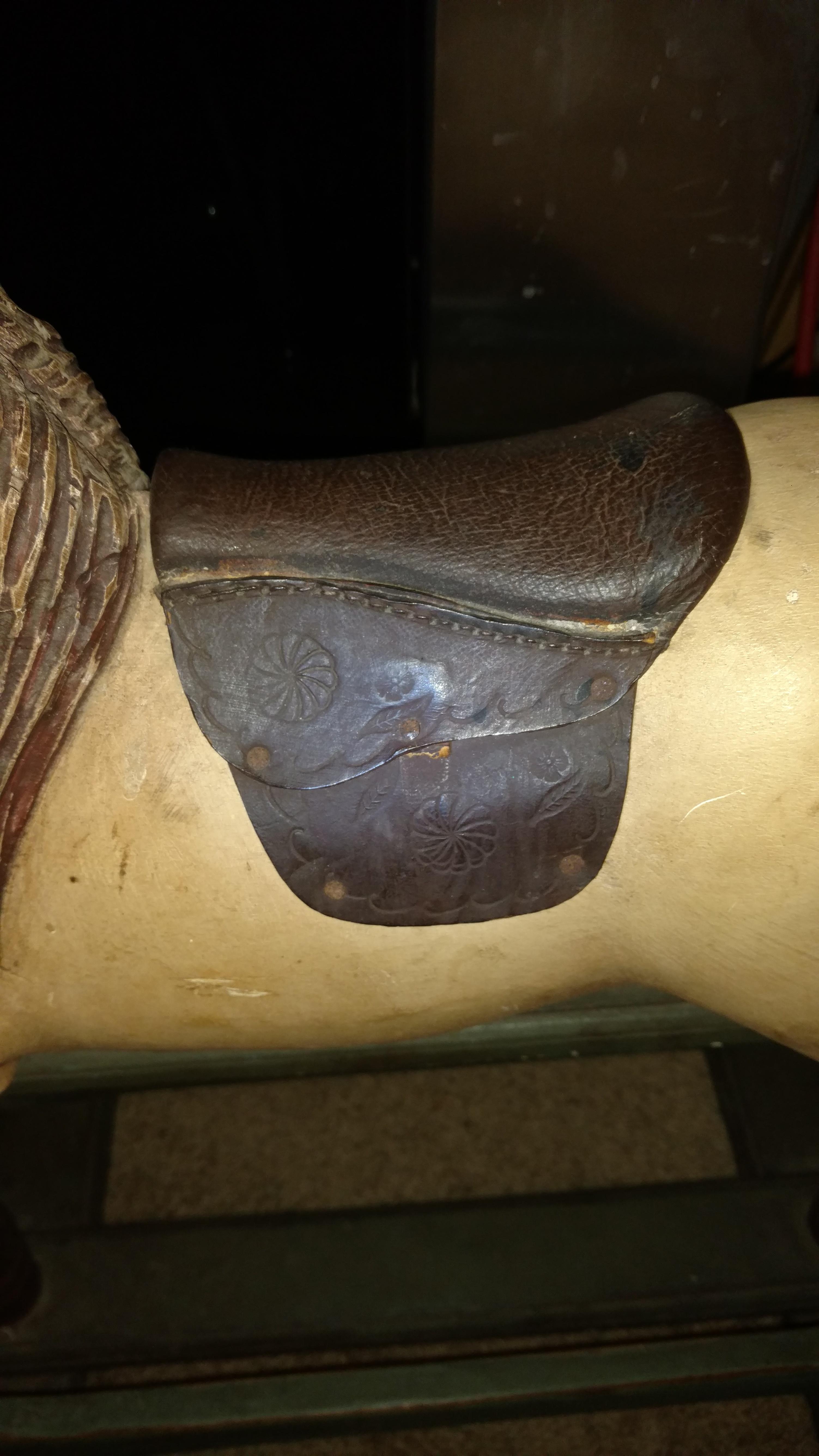 Solid wood body, red with black center glass eyes, leather saddle, horse hair tale. Langth is 66cm, height to ear tip 66cm (26"x 26") received as a gift so no knowledge of history or age.