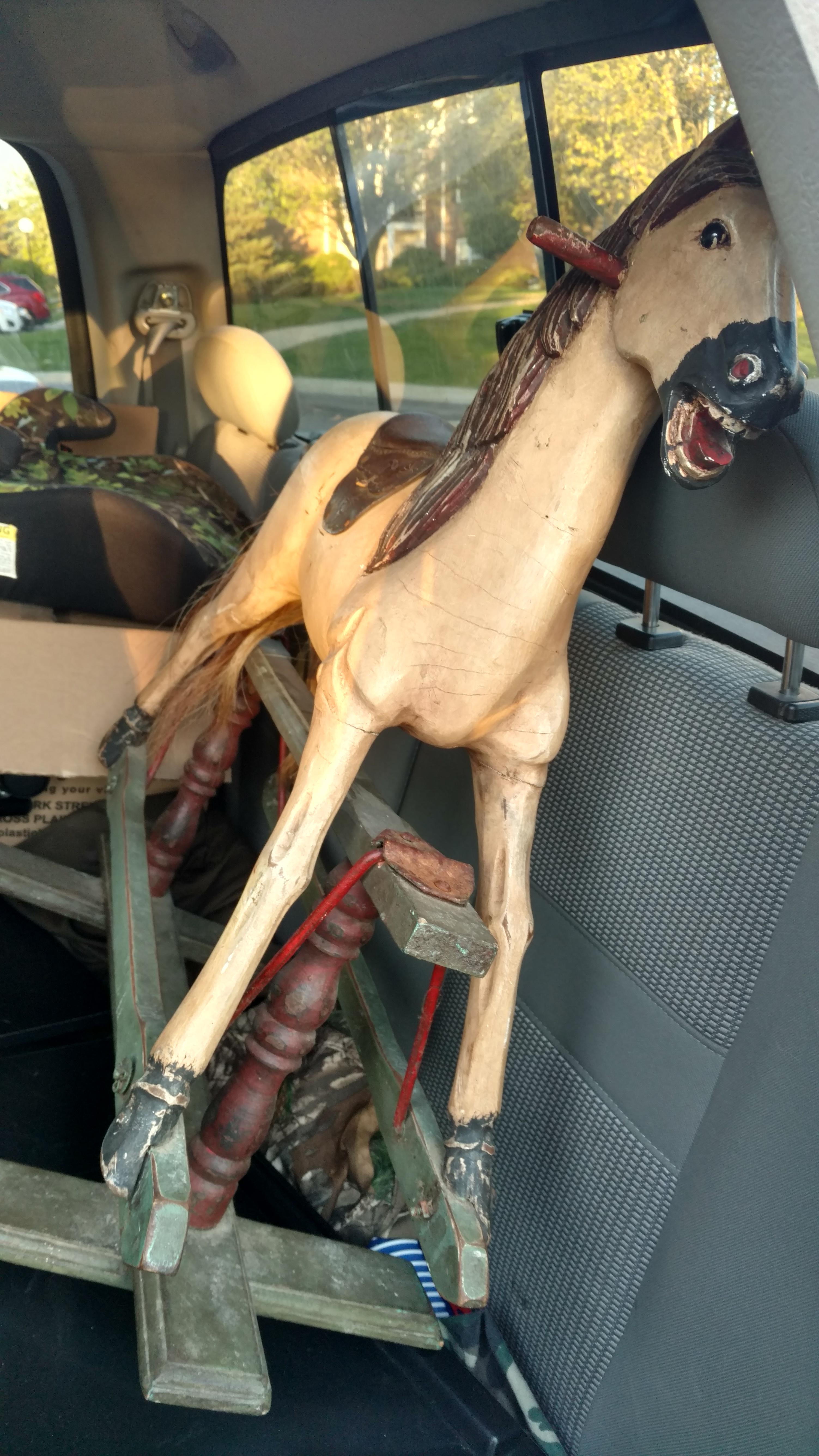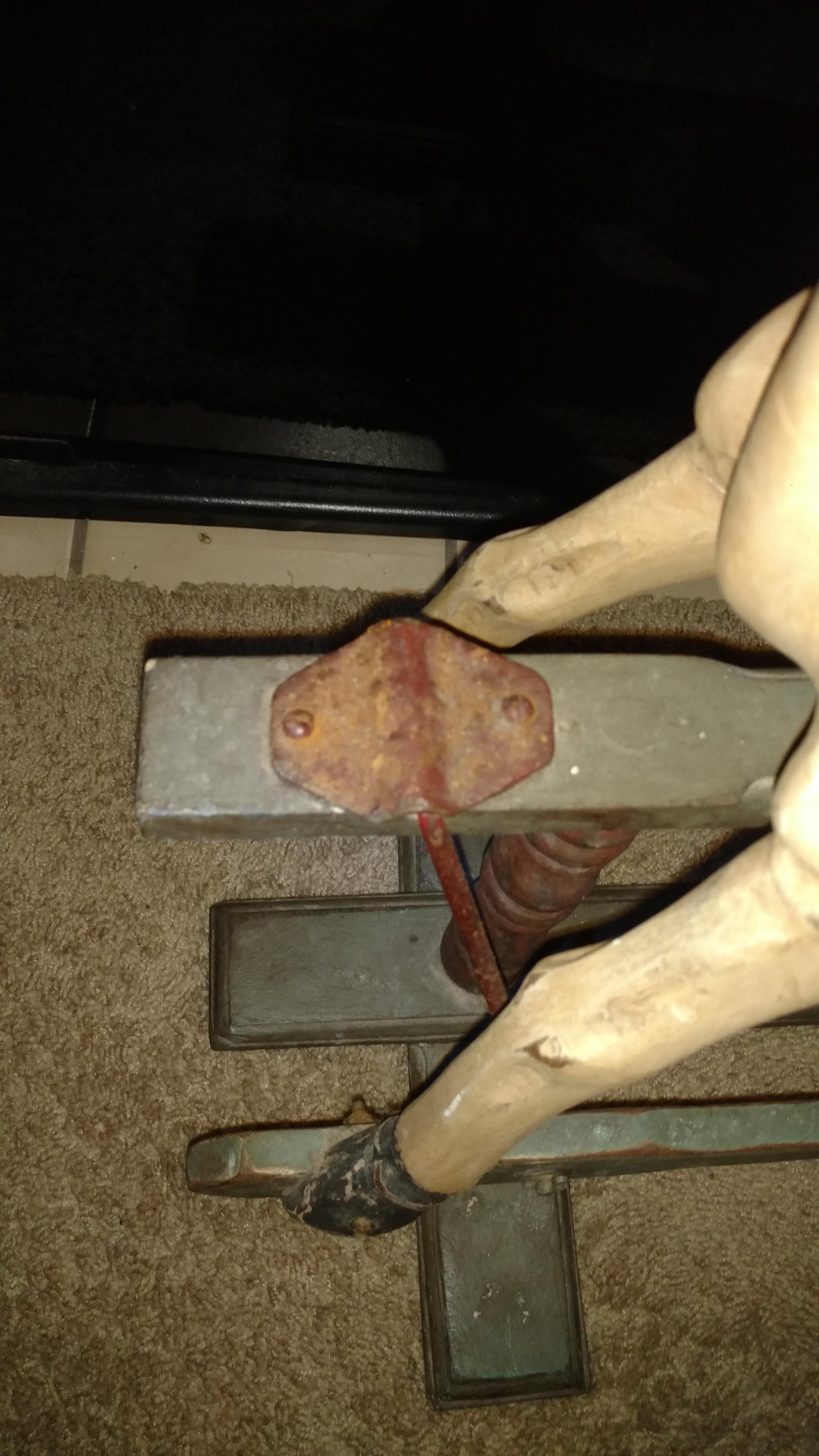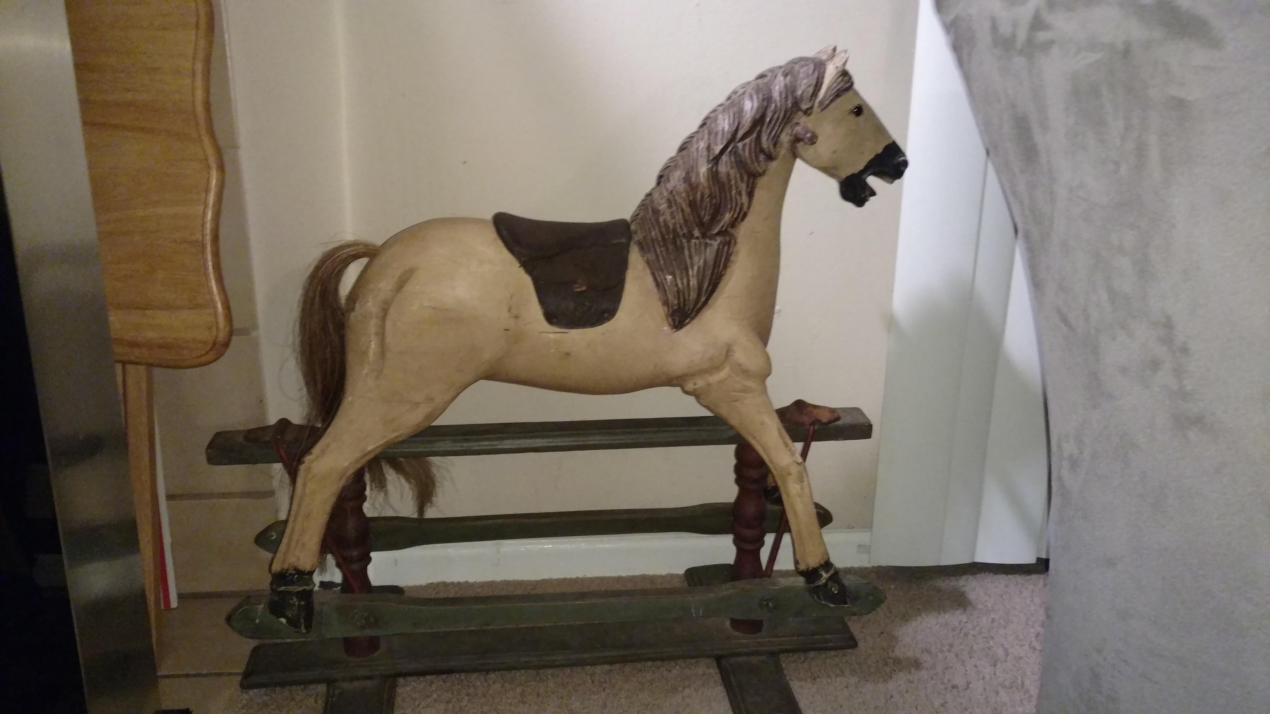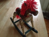 Solid wood body, red with black center glass eyes, leather saddle, horse hair tale. Langth is 66cm, height to ear tip 66cm (26"x 26") received as a gift so no knowledge of history or age.