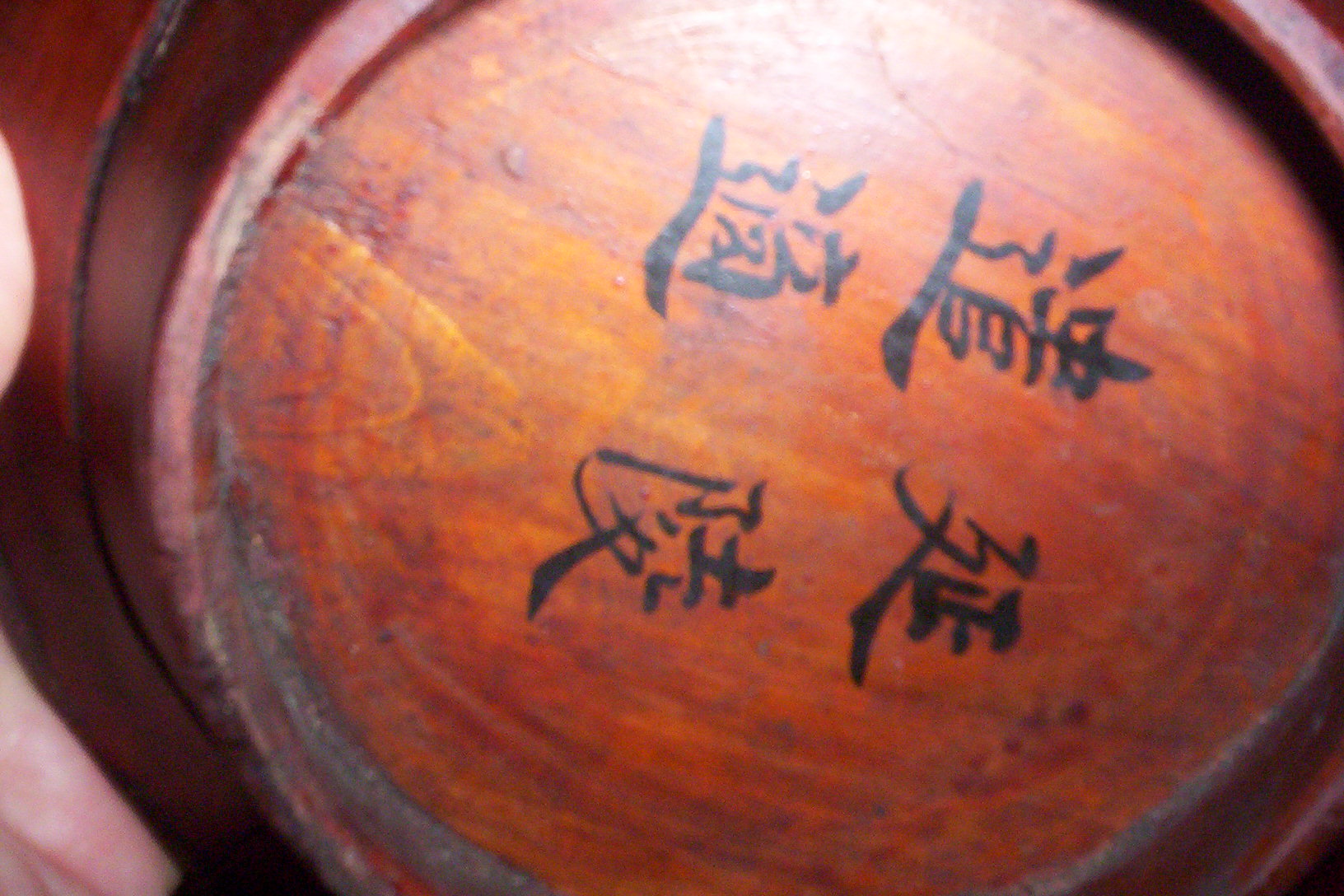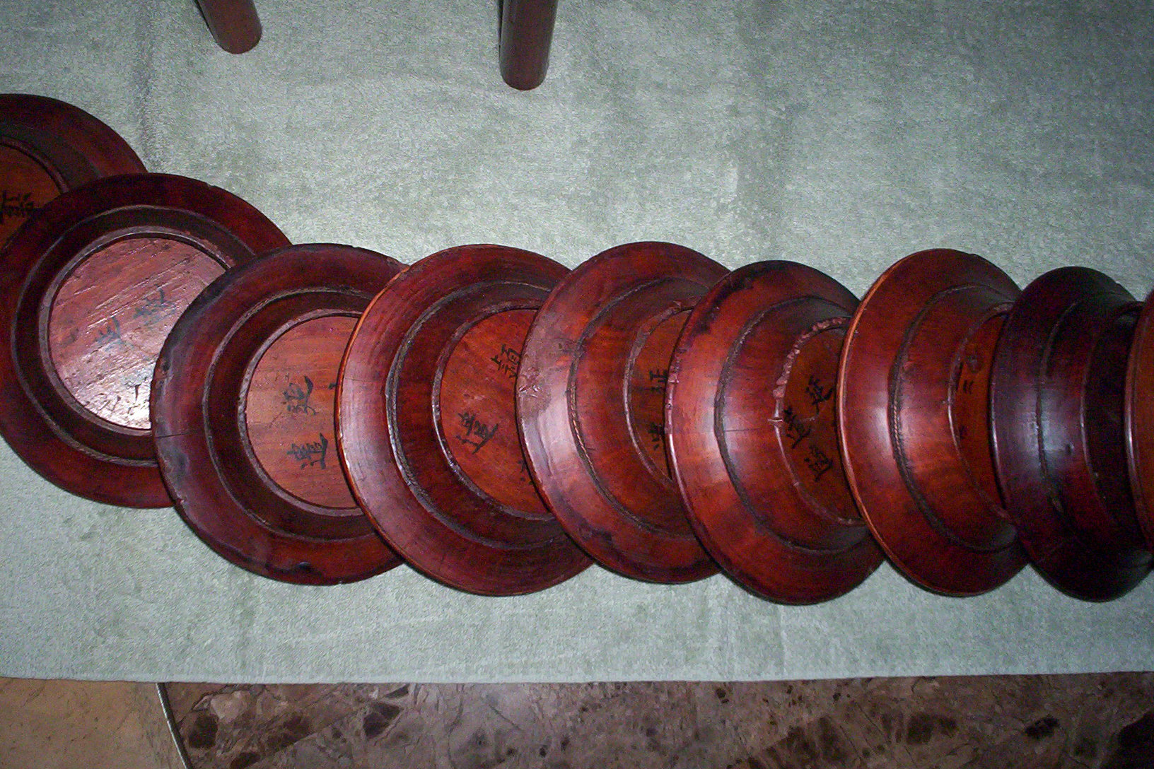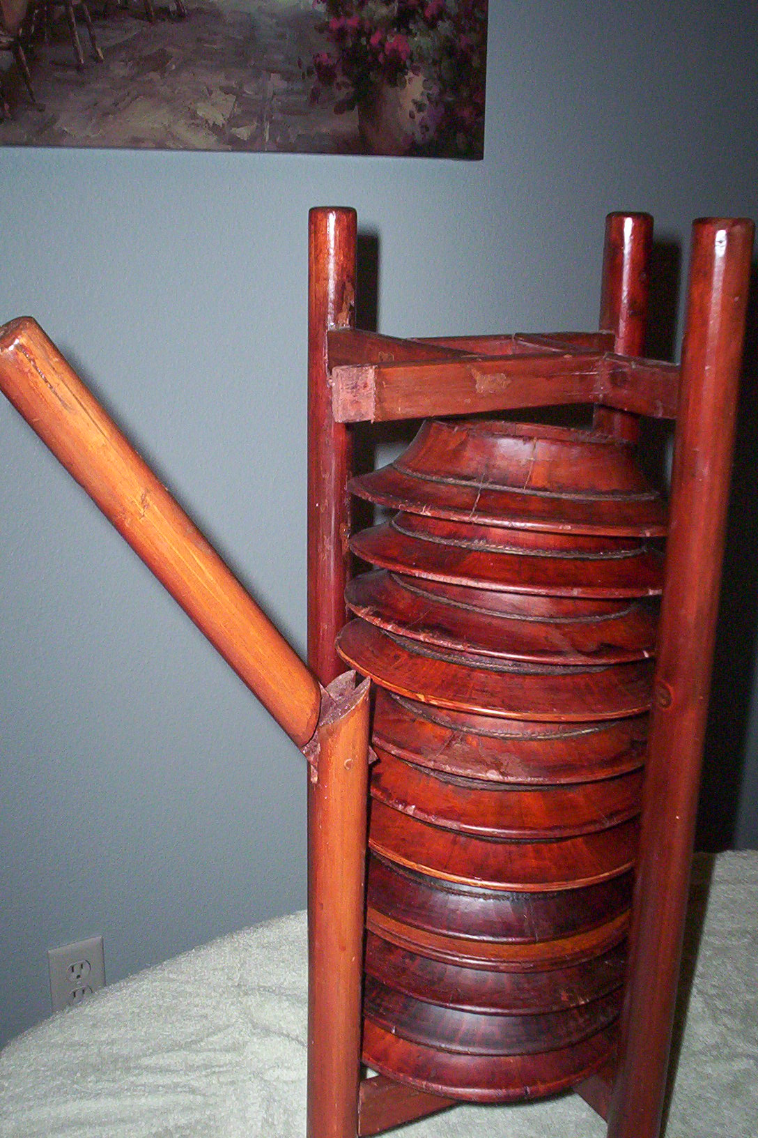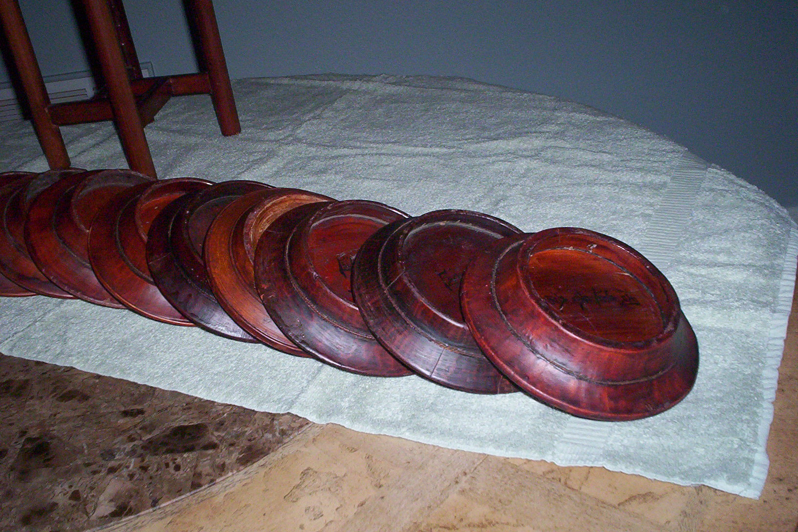 This is a set of hand made wooden bowls, all of which are unique and all of which have different Chinese writing on the bottom. They stand in a wooden stand that is made of the same dark, lighweight wood. The rack is all hand made too with mortised joints and the rack keeps the plates in place. One of the veritcal pieces of the rack is hinged and folds out and down so that the plates are accessible. 4 of the plates have cracks from the edge to the inner rim, but not all the way through the whole bowl. Some of the bowls have what appears to be woven wire on the lower inner edge at the bottom. The Chinese characters on the bottom of each bowl are different and are hand inked onto the bowls. The rack measures 22" High and is 8" x 8" square. The plates all measure approximately 7 1/4" in diameter. When put together, the set is amazingly light, so I am unable to identify the wood used in the making of this set.